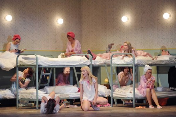 Weitab von jeglichem altbackenen, vordergründig exotischen Türkenkitsch verpassen die beiden Regisseurinnen Mozarts Singspiel ein gänzlich neues Gewand, für das sie auch eine eigene, neue Dialogfassung schufen. Gekonnt setzen sie bei den erotischen Wünschen pubertierender junger Menschen an, die sich an der Verwirklichung ihrer Sehnsüchte durch äußere Umstände gehindert sehen. Worin diese bestehen, ist klar: In dem strengem Regelwerk eines Internats, in das Szemerédy und Parditka die Handlung verlegen und sich damit in das Fahrwasser eines Peter Konwitschny begeben. Dieser wendete bei seiner Hamburger „Lohengrin“-Inszenierung von 1998 denselben Kunstgriff an. Der originelle Ansatzpunkt war mithin nichts Neues mehr, ging aber dennoch voll auf. Die beiden Regisseurinnen haben das Werk nur scheinbar gänzlich gegen den Strich gebürstet, der Kern wurde voll und ganz getroffen. Was sie an diesem überaus gelungenen Abend auf die Bühne des Landestheaters brachten, war ausgesprochen stimmig und mit hohem technischem Können auch äußerst kurzweilig, munter und temporeich umgesetzt. Darüber hinaus wird der Spagat zwischen ausgesprochen heiteren und tief ernsten Momenten aufs Beste eingehalten. Das macht ganz hohe Regiekunst aus.