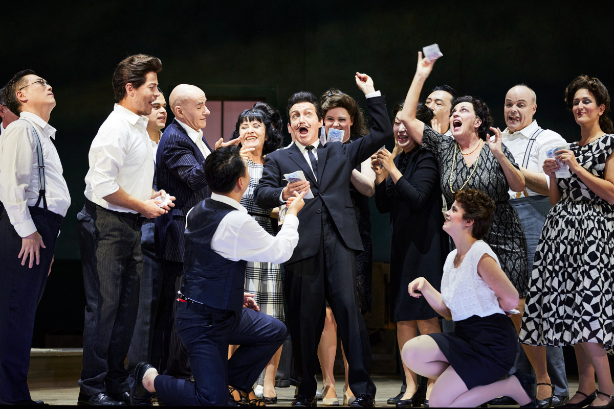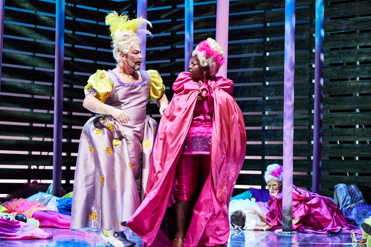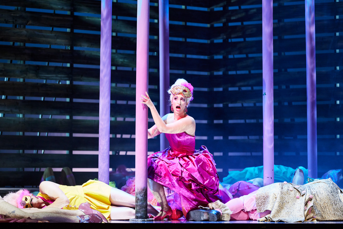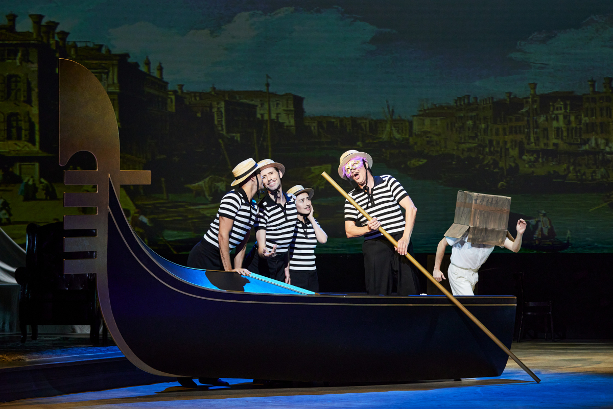 Während die Männer allesamt Trottel zu sein scheinen, sind die Frauen meist die Klügeren und Durchsetzungsfähigeren. Daniel Carlsons Pappacoda zeichnet sich durch eine voluminöse Stimme und den Hang zum Slapstick aus, der sich nicht aufs Stottern bei wiederkehrenden „S“-Lauten beschränkt, auch in der Unterhose erfüllt der Mann die Gesetze einer derben Komödie. Kommt hinzu, dass die stimmlich diskrete Ciboletta der Hlengiwe Precious Mkhwanazi permanent lollylutschend ihren Galan zu ohrfeigen pflegt. Caramello ist Dirk Mestmacher, als singender Gondoliere wird er, das ist reizend, von drei stummen Berufskollegen begleitet, von denen eine sich im stummen Karaoke übt, was schlicht und einfach witzig ist und dem Sentiment des eh nicht ganz ernst gemeinten, aber melodisch hinreißenden Liebesgesangs nichts von seinem Sentiment nimmt. Ansonsten tanzen die vier jungen Gondoliere als ein Quartett zweier heterosexueller Paare charmant über die Bühne. Des Herzogs Begehren heißt Barbara, Emily Lorini passt sich gut ins Ensemble ein. Der Obertrottel unter dem Senatoren ist Delaqua, er wird von Bartosz Araszkiewicz rollendeckend trottelhaft gebracht. Enrico Piselli ist der junge Amant, Jonas Hämmerle darf, niemand fragt warum, über den Boden rollen und sich minutenlang mit einem Pappkarton über dem Kopf über die Bühne tasten. Auch das ist sehr lustig, wenn auch nicht ausgesprochen fellinesk. Passend zur Absurdität einzelner – nicht aller – Szenen agiert der Page des Herzogs, der stets gleich zweimal auftritt und seine Botschaften stets zweimal verkündet; die beiden Damen Luise Hecht und Gabriele Bauer-Rosenthal machen das, zumal im Octavianskostüm, ganz allerliebst.