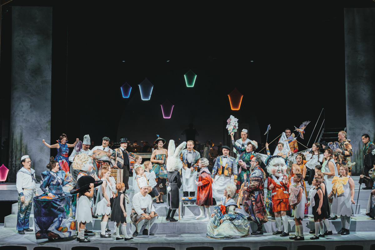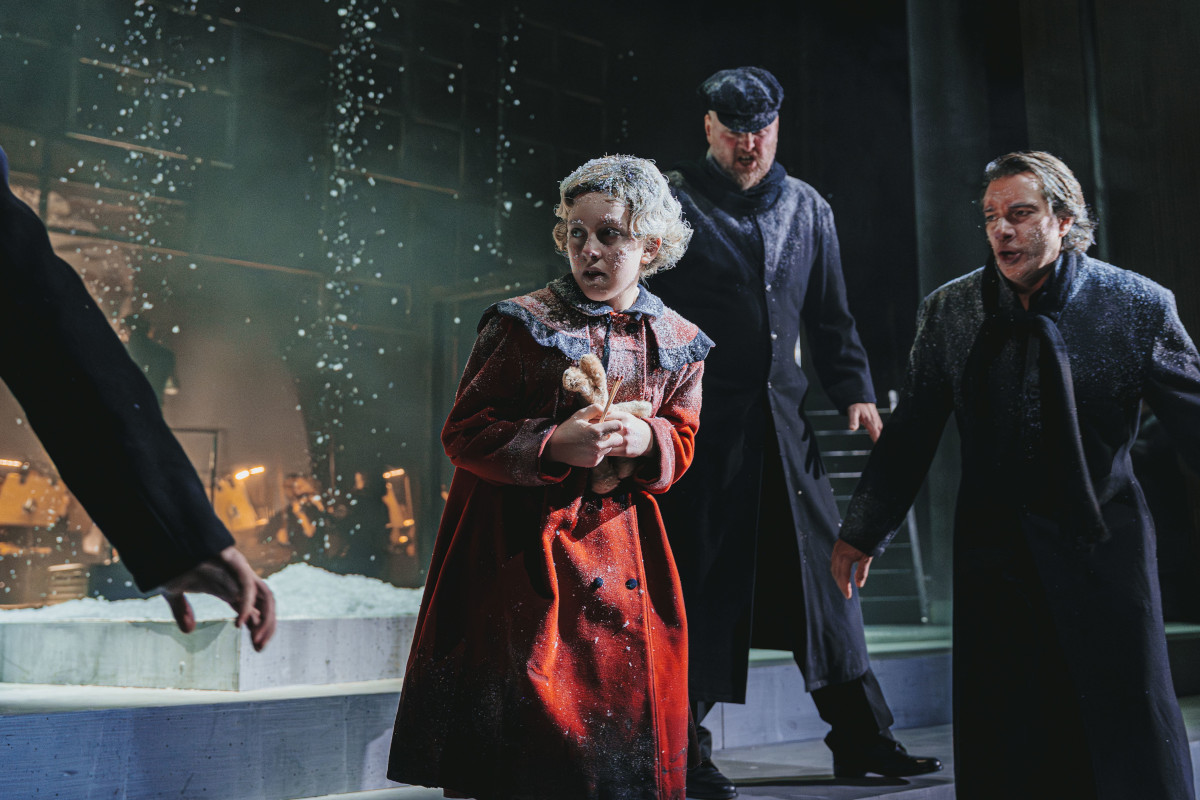 Das Fest und der Abschied, das Leben und der Tod: so einfach ist die Dramaturgie des ersten und zweiten Teils – eine Dramaturgie, die sich verschränkt, weil, das ist so Puccinis Tiefsinn, das klirrend-kalte Thema, das das dritte Bild eröffnet, eine Variante des fröhlichen Trompetenthemas des Café-Bildes ist. Verkettet werden die Szenen in Coburg durch eine Figur, die die Regisseurin Emily Hehl hinzugenommen, nicht erfunden hat: das Mädchen mit den Schwefelhölzern, bekannt aus Hans Christian Andersens erzkaltem Wintermärchen über eine eingefrorene Gesellschaft. Sie begleitet die Spieler vom ersten bis ins letzte Bild und ist im zweiten Teil einer Masse, die die Bühne bis zum Rande füllt. Vor dem fantastischen Café Momus wird ein Karneval inszeniert, in dem ein märchenhafter Riesenhase, eine Verdoppelung des kleinen Stofftierhasen in den Händen des Mädchens, mit einem Riesenzündholz tambourmajorgleich die Compagnie anführt – zuletzt hat er, das sind so nachdenkenswerte Details, ein Zündholz mit einem goldenen Kopf in der Hand; das Mädchen, das sich den Weihnachtsbasar zusammenzuträumen scheint, erlebt, wie Mimi, Rodolfo und all die Anderen (außer Alcindoro), ein paar Glücksminuten. Die Lichtblicke, das ist die Verbindung zwischen Andersen und Puccini (und Illica und Giacosa), erhellen, wie es im Programmheft heißt, „eine indifferent bleibende Umwelt nicht nachhaltig“, brechen sie aber für einen kurzen Augenblick auf.