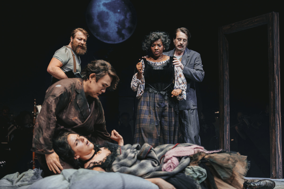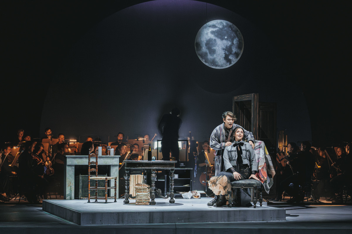 Dabei macht Emily Hehl zusammen mit dem Bühnenbildner Raphael René Jacobs und der Kostümfrau Emma Gaudiano kein Ausstattungstheater. Sie verortet die Handlung zwar durchaus eindeutig irgendwann um 1900, darauf verweisen schon die Drucke Toulouse-Lautrecscher Gemälde und Graphiken auf einzelnen Kostümen der Traumfestfeiernden eines zauberhaften fin de siècle. Doch genügt ansonsten eine schlichte Bühne mit einem 9 Quadratmeter kleinen, mit einer Eingangstür versehenen Podest, das im dritten Bild eine Schneefläche bedeckt, die, eingerollt, am Ende als Sterbelager Mimis dient. Aufgetreten wird durch die Eingänge des Zuschauerraums. Darüber schwebt ein Mond für die Beladenen, wie Eugene O’Neill gesagt hätte. Unter ihm findet die Oper statt, wie wir sie kennen – also gut und bühnenrealistisch packend. Kein Wunder bei so einem Traumpaar – oder anders: eine Art von Coburger Theaterwunder.