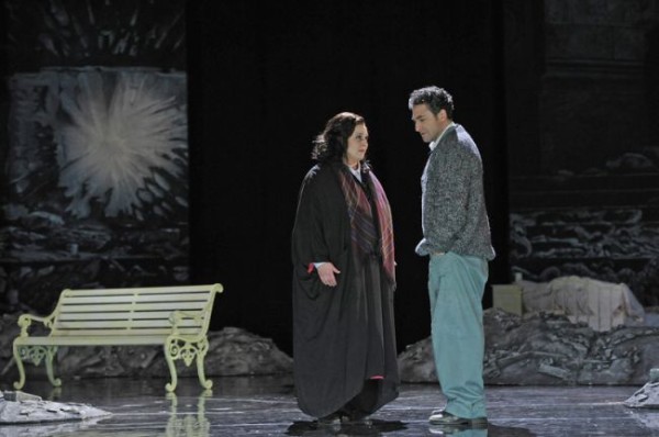 Auch diese Absage der Regisseurin an die Liebe auf den ersten Blick ist ein überzeugender Regeinfall, der sich von herkömmlichen Deutungsmustern etwas entfernt, was dem Werk indes gut bekommt. Frau Fassbaender wartet hier schon mit einigen modernen Ideen auf, die ganz im Widerspruch zur Tradition stehen, aber herrlich erfrischend wirken. Das hätte man von ihr nicht erwartet. Durchaus nachvollziehbar lässt sie im demolierten Paris Schmuggler im Trenchcoat und mit Aktentaschen auftreten, die versuchen, ihre illegalen Waren an den Mann zu bringen, was aber gar nicht so einfach ist. Der von der Regie hier nicht zur Karikatur degradierte, sondern ernst genommene Pariser Polizeichef Alcindoro scheint ein scharfes Auge auf die Schwarzhändler zu haben. Mehr Glück hat der Weihnachtsmann Parpignol, der seine Süßigkeiten problemlos an die französische und amerikanische Fahnen schwingenden Kinder loswird. An die Stelle der herkömmlichen Zollstation tritt im dritten Bild eine simple Parkbank, auf der am Ende der Szene die beiden Liebespaare gemeinsam Platz nehmen. Nicht ganz der Konvention entspricht auch der vierte Akt, in dem die Bohemièns in ihrer Ausgelassenheit kurzerhand das Bett abbauen und es auch dann nicht wieder herrichten, als die todkranke Mimi hereintritt. Ihr wird aus Laken und Kissen eine Lagerstatt auf der Erde im linken Teil der Bühne bereitet – auch das war ein Einfall, der für Frau Fassbaender eher untypisch ist. Sie hat ihre Produktion schon mit mancher ungewöhnlichen Idee angereichert, die viel szenische Abwechslung in den Nachmittag brachte.