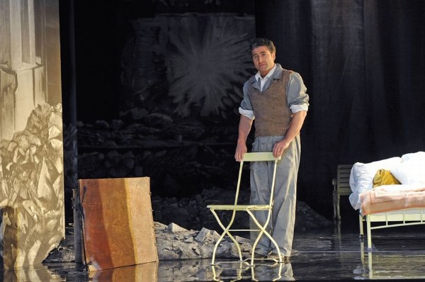 Die Damen Fassbaender und Munzer haben die Oper in eine karge, nüchterne Trümmerlandschaft verlegt. Das Einheitsbühnenbild dominieren die Ruinen ehemals ansehnlicher Häuser, in die die verschiedenen Szenen einfühlsam eingepasst werden. Regisseurin und Bühnenbildnerin lassen das Stück in einem zerstörten Paris kurz nach der Befreiung von der Nazi-Terrorherrschaft spielen. Nun mag so mancher diesen Regieeinfall mit der Begründung für verfehlt halten, dass Paris den Zweiten Weltkrieg doch heil überstanden und keine bleibenden Schäden davongetragen hat. Das ist indes nur teilweise richtig. So ganz ungeschoren davongekommen ist die französische Metropole nicht. Zwar wurde Paris von Kommandant Dietrich von Choltitz am 25. 8.1944 nahezu unbeschädigt an die vorrückende Zweite französische Panzerdivision übergeben, aber bereits wenig später, in der Nacht von 26. 8. auf den 27.8.1944, unternahm die deutsche Luftwaffe einen Bombenangriff auf Paris, bei dem cirka 600 Gebäude zerstört oder beschädigt wurden. Demgemäß hat der Einfall des Regieteams, Paris in Trümmern liegend vorzuführen, durchaus seine Berechtigung. Vordergründiger Kitsch wird auf diese Weise vermieden.