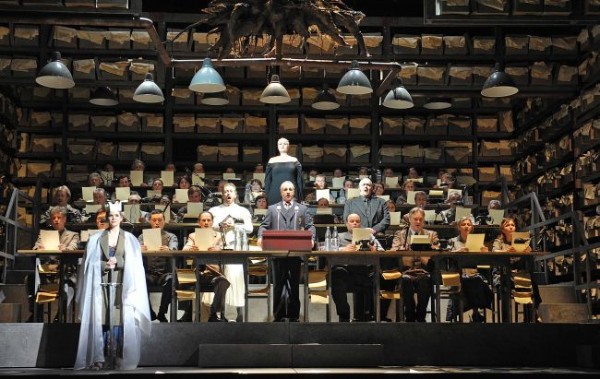 Lohengrin ist bei ihm kein gottgesandter Gralsritter, kein von einer höheren Macht gesandter Retter der Unschuld. Das fließend weiße Gewand, das ihm von Christof Cremer verpasst wurde, ist nur schöner Schein, ein Blendwerk für das Auge, unter dem sich das wahre Gesicht des Protagonisten versteckt. Er betritt hier als weltlicher Machtpolitiker den von Rifail Ajdarpasic eingerichteten, mit Abgeordnetenbänken und Rednerpult samt Mikrophon eingerichteten Parlamentssaal, in dem Recht und Gesetz augenscheinlich keine große Rolle mehr spielen. Das wird durch die unter dem Schnürboden gerade noch sichtbaren, in der Luft schwebenden Fundamente der konventionellen Gerichtseiche nur zu deutlich. Zahlreiche Regale voller angehäufter Akten geben beredtes Zeugnis von so manchem Rechtsfall, der für den oder die Angeklagte sicher nicht immer positiv ausging. Das Parlament als Einheitsbühnenbild ist in Carlos Wagners Deutung gleichzeitig auch Gerichtssaal, der sich bei Lohengrins Auftritt zum Hintergrund hin öffnet. Hier fühlt man sich auch visuell an Frank Hilbrichs grandiose Freiburger Interpretation des Stoffes erinnert, der in einer riesigen Bibliothek spielte, in dem die Brabanter die Überlieferungen der Geschichte aufbewahrt haben.