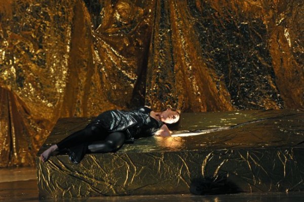 Bei Theorell spielt sich die Handlung nicht auf der Terrasse des Herodes’ schen Palastes ab, sondern in einer von Alejandro Tarragüel de Rubio – von ihm stammen auch die blendenden, verschiedenen Ären entlehnten Kostüme – Grotte, in der alles aus Gold ist. Sogar die Zisterne, in der Jochanaan gefangen gehalten wird, ist keine „schwarze Höhle“, sondern golden. Auch die dramaturgisch wichtige Silberschüssel, in der der jüdäischen Prinzessin in der letzten Szene der Kopf des Propheten serviert wird, besteht hier entgegen der Vorlage aus blankem Gold und ist zudem mit Wasser gefüllt. All der äußere Glanz und Prunk soll indes nicht auf den großen Reichtum von Herodes hindeuten, sondern steht vielmehr für eine vordergründige, sinnentleerte und auf reinen Genuss ausgerichtete Welt, in der man Feste feiert – im konkreten Fall einen Maskenball – und sich zügellosen Ausschweifungen hingibt. Es ist eine sehr dekadente Gesellschaft, die der Regisseur den Zuschauern hier vor Augen führt und deren herausragender Vertreter der mit rotem Königsmantel, gold schimmerndem Anzug und Lorbeerkranz ausgestattete Herodes ist, der aus seiner Lüsternheit auf Salome keinen Hehl macht.