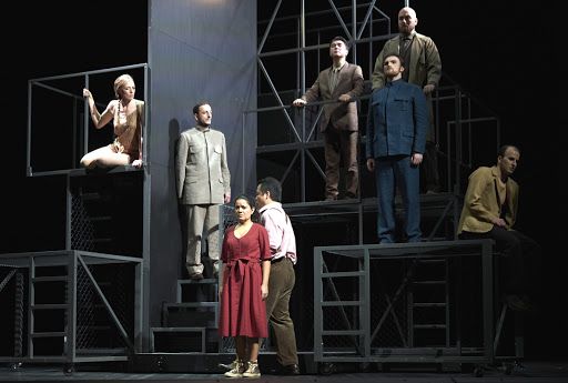 Zudem bringt Regisseur Jan Eßinger, der sein Handwerk als Regieassistent an der Komischen Oper Berlin und dem Züricher Opernhaus erlernt hat, eine sparsam konzentrierte Inszenierung auf die von Sonja Fürstl entworfene Bühne. Ein gigantische, drehbare Stahlkonstruktion bietet mit ihren vielen Spielflächen das treffende Bühnenbild für diese Oper. Auch gelingt es der Regie in diesem Raum die wechselnden Schauplätze darzustellen. Die Beleuchtung von Henning Streck setzt zudem genaue atmosphärische Akzente.Regisseur Jan Eßinger verzichtet auf alle Requisiten und schafft es, trotz einer stilisierten Spielweise, glaubhafte Charakter auf die Bühne zu bringen. Die Detmolder Aufführung ist somit stärker als das Stück von sich aus ist.