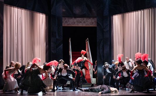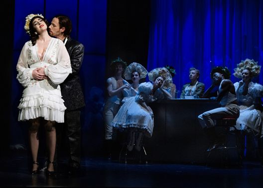 Emily Dorn (als Hanna Glawari) und Todd Boyce (als Graf Danilo) singen und spielen ihre Rolle mit einer nonchalanten Sicherheit, manchmal mit einer so natürlichen Selbstverständlichkeit, dass der Eindruck entsteht, man sei als Zuschauer auch mitten im Geschehen an der anderen Seite der Rampe, im Maxim oder anderswo, wo die Menschen drumherum sich unterhalten, tanzen, streiten, trinken und flirten, gehen und kommen, wie in einem anderen beliebigen Lokal. Und dabei gibt es nichts Operettenhaftes – ausgenommen den weißen Schal um den Hals des Grafen. Das andere Paar, Penelope Kendros (Valencienne) und Stephen Chambers (Camille de Rosillon) gestalten ihre Rolle mit einer vorsichtigen Selbstironie. In einer brenzligen Lage bleiben sie immer noch sympathisch albern – da scheint die Operette spürbar durch, ähnlich wie im Spiel von Andreas Jören (Baron Mirko Zeta) und Florian Zanger (Vicomte Cascada).