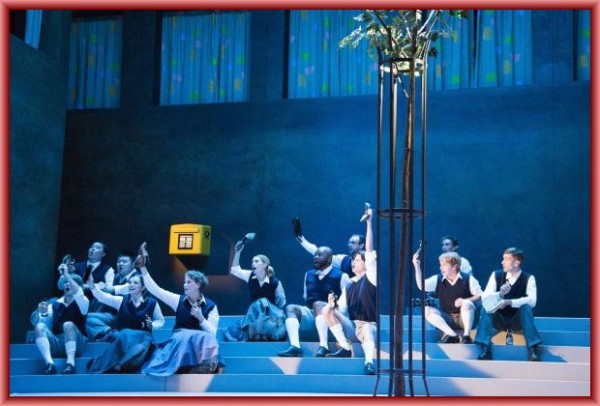 Wandervogel Stolzing lässt im ersten Akt die Meistersinger von der Natur träumen: Bei seinem „Fanget an“ wird der Bühnenraum grün ausgeleuchtet und ein Baum hängt vom Schnürboden herab. Leider wird dieser Ansatz nicht weiter verfolgt. Auch würde dieser Ansatz viel besser zu den Blumenkindern der 60er oder der Grünen-Bewegung der 70er und 80er Jahre passen.