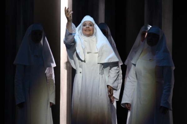 Das Bühnenbild beschränkt sich auf schlichte, grau angerauchte Wände mit Zellentüren, nur das Licht deutet Änderungen in Zeit und Raum an – beeindruckende Arbeit von Eva-Nadin Krischok. Darin der weißgekleidete Chor der Nonnen – eine formlose Masse, die sich ausbreitet, zusammenzieht, pulsiert und wieder erstarrt – ein Hintergrund des Dramas, das sich nur auf die Titelheldin konzentriert. In dieser Masse gefangen ist sie allein mit ihrem Schmerz. Ergreifend Marianne Kienbaum-Nasrawi in der Rolle der Angelica. Sie spielt mit Andeutungen, Schemen, mit einer Stimmzurückhaltung, die die Dramatik noch steigern lässt. Schade nur um die Schlussszene: Marianne Kienbaum-Nasrawi verlässt die dramatisch wirksame Zurückhaltung und robbt in konvulsiver Agonie ihrem Kind entgegen, das leibhaftig aus der Kulisse vortritt. Leider kitschig dies.