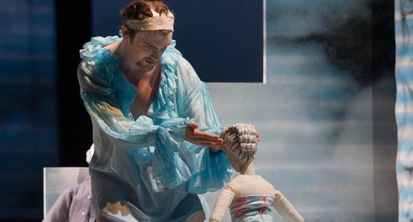 Die Sängerinnen und Sänger verkörpern weniger lebende Menschen, als vielmehr große Figuren in einem edlen Marionettenspiel, die ausgestattet sind mit menschlichen Emotionen und geführt von der Hand eines gerissenen Strippenziehers dem gesteuerten Schicksal folgen. Der Graf will Sex mit Untertanen, die Gräfin trauert um die verlorene Liebe, Susanna will den Figaro, aber die Amoren des Grafen sind auch verlockend, der klamaukeske Basilio (Nando Zickgraf) verliert seine frühere – eingebildete – Würde des Musikgelehrten, Cherubino tobt mit pubertären erotischen Hoffnungen herum und spielt mit seiner Stimme (Dorothee Bienert) auf die – irgendwann und womöglich – künftige Mannesstärke. In einer dramatischen Parallelebene führt ein Cherubin d’amore (Felix Hennig) das Spiel weiter. Mit kleinen Puppen, die den echten Darstellern, den großen Figuren en miniature nachgebildet sind, mischt er sich in die Handlung ein, streift mit seinen Engelsflügeln die großen Figuren, setzt die kleinen zusammen, reißt sie auseinander, setzt sie anders zusammen, legt sie in die Hände der großen Figuren und spielt, wie diese, mit der Liebe, der Treue und Untreue. Und da es sich um ein Spiel, ein Zuckerdrama handelt, sehen die Darsteller, also die großen Figuren auch entsprechend aus. Gekleidet in farbenfrohe Kostüme (Carl-Christian Andresen) aus teuren, edel wirkenden Stoffen, zu sparsamen aber fantasiereichen Formen drapiert, wechseln sie gegenseitig die Standorte oder bewegen sich manchmal im Kreis, als seien sie tatsächlich kostbare Marionetten auf der Drehbühne eines Jahrmarkt-Puppenspiels. Es ist nur eine sparsame, diskrete choreographische Andeutung, diese aber haftet in der Erinnerung und lässt nicht vergessen, dass es sich hier um eine Phantasiewelt handelt.