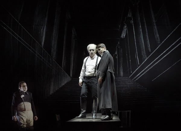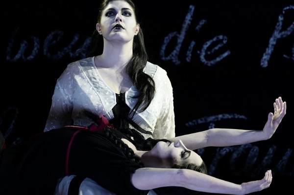 Als sich der Vorhang nach der bespielten Ouvertüre hebt, glaubt man noch für einen Moment, man habe die falsche Vorstellung erwischt, zeigt man in Detmold derzeit doch das auf den gleichnamigen Comics und Filmen basierende Grusical The Addam’s Family. Ganz in schwarz-weiß sind die Kostüme von Lukas Noll gehalten, kalkweiß sind auch die Gesichter mit schwarzumränderten Augen, ebenso schwarz sind die Lippen der Protagonisten (beeindruckende Maske: Kerstin Steinke), die teilweise scheinbar aus Särgen steigen und somit erinnert das Setting auf den ersten Blick an die Geschichten rund um Morticia Addams und ihre Lieben. Doch Regisseur Christian von Götz zitiert vielmehr die Stummfilmwelt der 1920er Jahre, den morbiden Charme, das plakative Spiel der Akteure und setzt die Handlung, die immer wieder durch Zuziehen eines Brechtvorhangs mit aufgedrucktem Schiller-Zitat unterbrochen wird, vor an Linolschnitte erinnernden Prospekten in Szene, mit denen Lukas Noll eine ungeheure Tiefe erzeugt. Düster geht es da nicht nur farblich zu auf der Bühne, auch der Tod, auf den von Beginn an alles zuzulaufen scheint, ist allgegenwärtig, denn von Götz hat eine allegorische Figur in Form der sich ausdrucksvoll verbiegenden Tänzerin Caroline Lusken hinzugefügt, die gegen Ende des Abends allen Sterbenden das Gesicht leider allzu plakativ mit roter Farbe beschmiert, ansonsten aber durch sinnfällige Akzente setzt. Christian von Götz gelingt durch durchdachte Personenregie ein weitestgehend spannender Abend, doch leider gelingt es ihm nicht, den zu Längen neigenden Schluss zu beleben, weil er just dann die Szene in Statik ertränkt. Alles in allem ist aber die Lesart des aus Lübeck stammenden Regisseurs, der ansonsten als Spezialist für Musical und Operette gilt, so schlüssig wie unterhaltsam, zeichnet er doch beispielsweise den Fiesling Wurm nicht als reinen intriganten, sondern als Menschen, für den man sogar Mitgefühl entwickeln kann.
