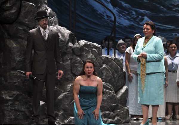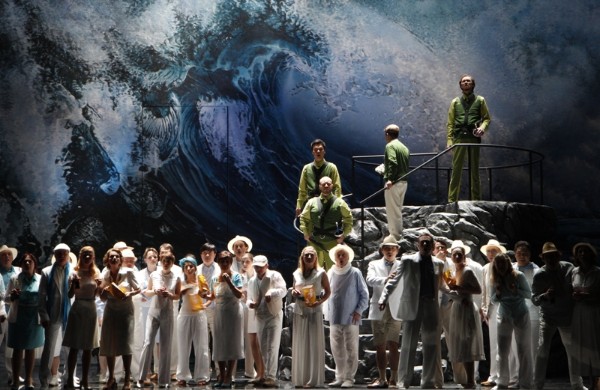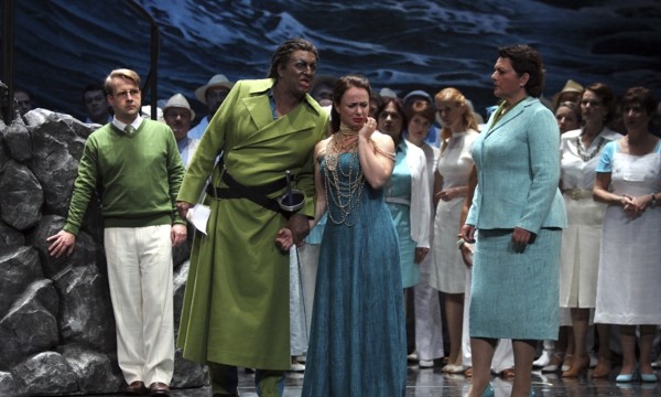 Die Detmolder Otello-Inszenierung (Regie Kay Metzger) weckt in mir ambivalente Gefühle / Reaktionen / Gedanken, ich versuche darin einen Leitfaden herauszuklären, etwas, woran ich mich festhalten könnte. Und nichts, ich finde nichts. Entweder gab es hier keine Leitidee (der Opernstoff an sich ist schon klar genug, und Verdi mit Boito lassen wenig Spielraum für freien Lauf von weitreichenden Regieeinfällen), oder die Leitidee wurde so verhüllt… Ja, eben, in was verhüllt, und was muss ich enthüllen, um sie zu finden? Zu verstehen? Ich greife ins Leere, und wenn, dann sehe ich das kleine Theater zur grandiosen Musik. – Betont zeitgenössisch gekleideter Chor lässt an Gaffer am Wrack von Costa Concordia denken, die Riesenwellen in der Bühnentiefe an eine Fototapete im Wohnzimmer, das Steingebilde – das einzige plastische Bühnenelement – an eine im Schrebergarten nachgebaute antike Grotte (Bühne & Ausstattung Petra Mollérus). Alles zum Schein? Pars pro toto für das Ambiente eines biederen kleinbürgerlichen Wohnzimmers, in dem… Ja, das ist es, die häusliche Gewalt in den vier Wänden eines gemütlichen Heimes.
