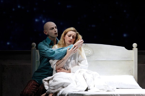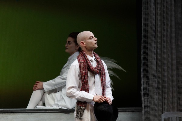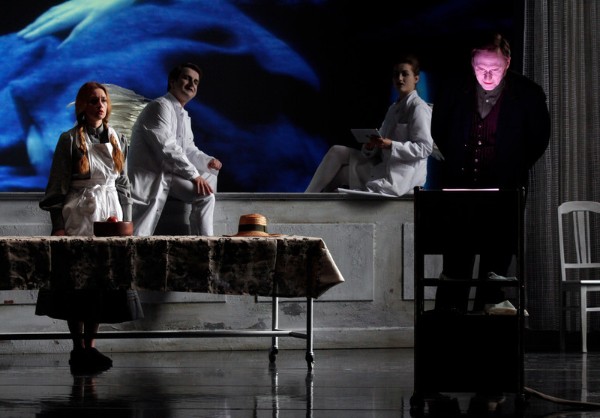 Kai Metzger verstand diese Oper als ein Kabinettstück: Eine kleine Besetzung war ohnehin vorgegeben, der während des ganzen Abends unverändert gebliebene Raum, passt sich den Dimensionen des kleinen Landestheaters konsequent und selbstverständlich an (Bühne und Kostüme Petra Mollérus). Es ist ein verlassener, verfallener Raum einer Heilanstalt. Hierhin verirrt sich nur selten das Anstaltspersonal, und wenn, dann ohne die Berührung mit den Protagonisten. Diese sind wie Geister aus einer anderen Welt, einer anderen Wirklichkeit, die parallel aber vom imaginären hintergründigen Anstaltsleben nicht wahrnehmbar verläuft. Doch nicht ganz konsequent, ab und zu greift das stumme Personal ein, als wenn es Verstorbene versorgte. Die Dramatis personæ bleiben davon unberührt, sie funktionieren auf einer anderen intellektuellen Ebene, eingekapselt in ihrer Gefühlswelt, dramaturgisch so glaubwürdig aufgebaut, dass man die Ergriffenheit im Saal spürt. „Einfach genial“, sagt die Freundin.