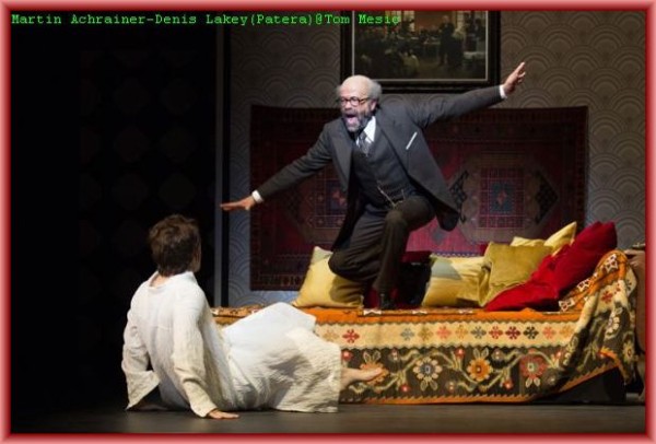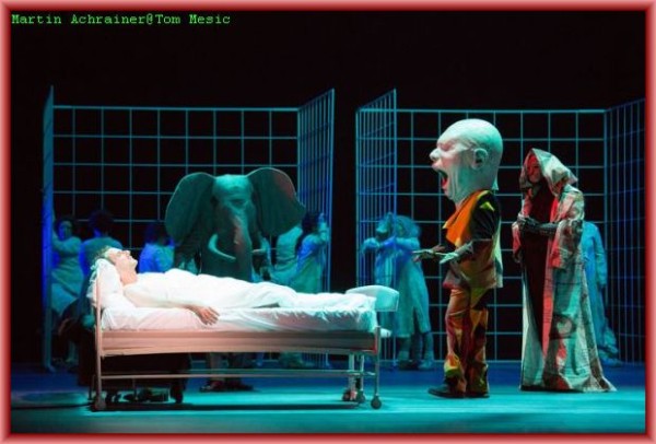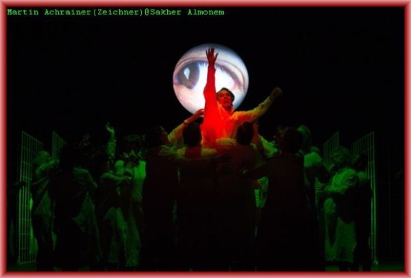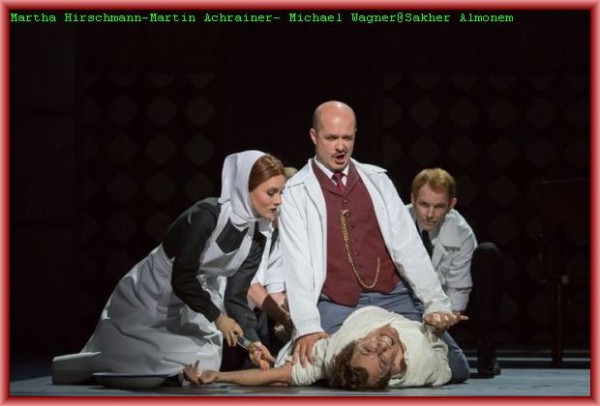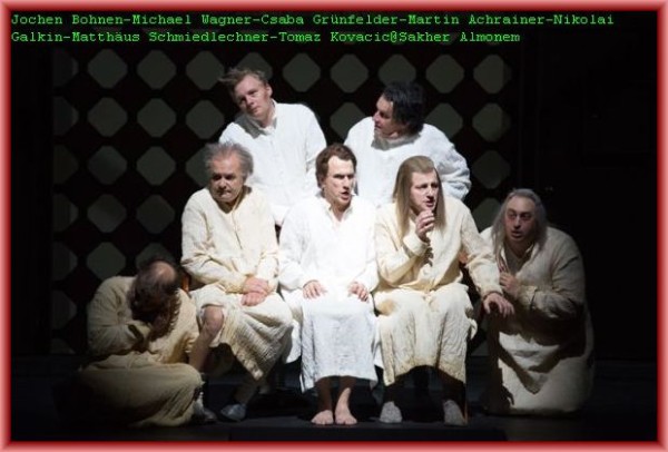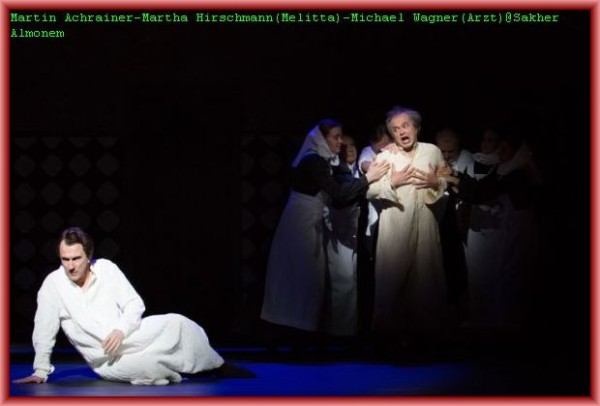 Sein tonloser qualvoller Schrei zu Beginn der Oper ist eine cineastische Referenz an Al Pacino auf den Stufen des Teatro Massimo in Palermo in Francis Ford Coppollas Film „The Godfather Part III“. Und er demonstriert auch seine körperliche Beherrschung, wenn er den „liegenden Helden“ (Supta- Virasana), eine Yoga Position, ausführt. Die „Anstalt“ dient dem Zeichner zunächst noch als Inspirationsquelle, doch nach dem Tod seiner Frau keimen in ihm ungeheure Horrorvisionen auf, auf deren Höhepunkt das Traumreich einer Irrenanstalt langsam wieder untergeht. Seine Gattin (Gotho Griesmeier) erscheint und holt den „geheilten“ Zeichner wieder ab. Auf Grund einer Entzündung konnte sie die Rolle an diesem Abend nur ausdrucksstark spielen, gesungen hat sie vom Rand der Bühne aus den bereitgestellten Notenblättern besonders ausdrucksstark Jennifer Davison. Bravo! Countertenor Denis Lakey hat die Rolle des Patera bereits bei der Uraufführung gesungen. Er verlieh der Figur einen skurril dämonischen Ausdruck und erinnerte etwas an Dr. Miracle aus Offenbachs Les Contes d’Hoffmann. Nikolai Galkin gefiel in der Doppelrolle eines Verkäufers und eines Wirtes. Rollengerecht ergänzten spielfreudig Csaba Grünfelder als Kleiner Herr und Amtsperson, Michael Wagner als Friseur und Arzt, Matthäus Schmidlechner als Gast und Zoologe, John F. Kutil in der Sprechrolle von Pateras Gegenspieler Herkules Bell, Martha Hirschmann als laszive Krankenschwester Melitta mit gut geführtem Sopran und Jochen Bohnen sowie Tomaz Kovacic als zwei Schachspieler.