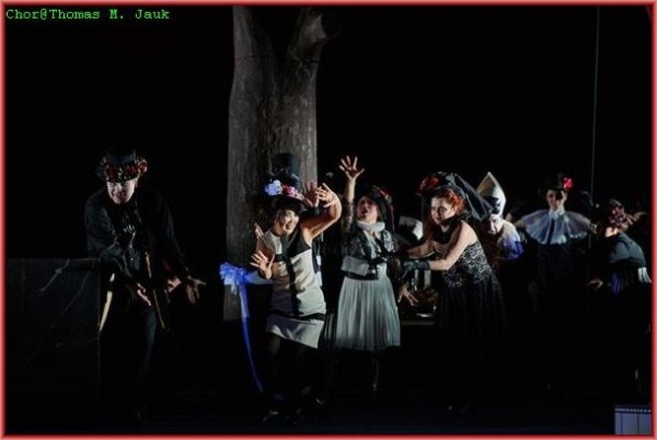 Die Belgierin Karine Van Hercke ersann die Bühnenausstattung und die Kostüme. Der Raum wird von ihr abstrakt gehalten. Eine riesige Kirchenrosette wird im Verlauf des ersten Aktes dann mit düsteren Videoanimationen von Aurélie Remy belebt. Der von Georg Leopold bestens einstudierte Chor des Landestheaters Linz trug maßgeblichen Anteil am Erfolg dieses Abends.