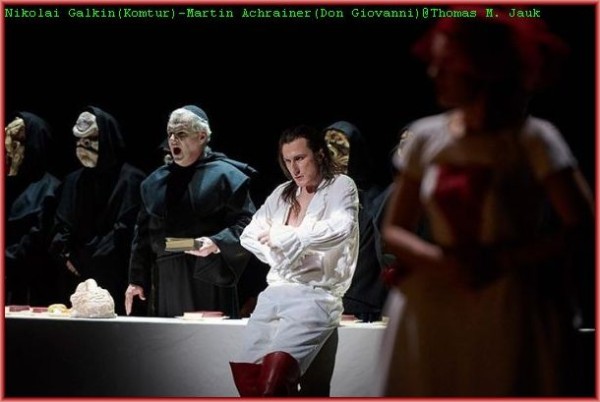 In leisen, fast wehmütigen Rezitativen, die Martin Achrainer in der Titelrolle so ergreifend gestaltet, wird einem die Ambivalenz dieser tragischen Figur in ihrer charakterlichen Nähe zu ihrem Epigonen Giacomo Girolamo Casanova erst so richtig bewusst. Martin Achrainer hat diese Partie bereits 2008 gesungen und ist mit ihr und an ihr gewachsen. Neben ihm konnten sich gesanglich wie darstellerisch vor allem das Bauernpaar Masetto und Zerlina behaupten. Till von Orlowsky, der im Herbst 2016 an der Mailänder Scala als Papageno in Mozarts Zauberflöte zu erleben war, stattete auch den Masetto mit gut geführtem, weichen Bariton aus. Ideal mit dem wunderbaren Sopran von Fenja Lukas als Zerlina. Nikolai Galkin sang einen textverständlichen Komtur mit resolutem Bass. Einem Edelmann geziemend versucht er den Verführer seiner Tochter im Duell mit dem Degen zu töten. Don Giovanni in die Enge getrieben findet aber in höchster Not nur mehr Gelegenheit, sein Pistoletto zu ziehen und den über ihn gebeugten Komtur auf diese Weise schnell und schmerzlos ins Jenseits zu befördern. Von Don Giovanni später zum Diner geladen, wird sein steinernes Abbild auf eine drei Zinnen aufweisende Mauer furchteinflößend projiziert. Beim Diner erscheint er dann in Begleitung von 12 dunklen Gestalten aus dem Jenseits, die an die Studien des britischen Malers Francis Bacon nach Velázquez‘ Porträt von Papst Innozenz X. erinnert, hier in einer Paraphrase auf das Letzte Abendmahl. Margareta Klobučar war eine imposante Donna Anna in weit ausladendem schwarzem Reifrock. Leider hörte sich ihr Sopran manchmal recht schrill an und wurde meiner Meinung nach auch etwas unausgewogen geführt. Gesanglich etwas enttäuschend für mich hörte sich Gotho Griesmeier als Donna Elvira an diesem Abend an.
