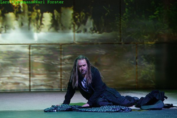 Der Humor, so dachte sich Regisseur Uwe Eric Laufenberg offensichtlich, darf in einem „Satyrspiel“ nicht fehlen und so „spällt“ Siegfried mit seinem frisch gegossenen Schwert Nothung zu Ende des ersten Aktes anstelle des Ambosses eine Wassermelone, spielt mit Teddybären und Legomodellen. Und hetzt statt des obligaten, in einem Bärenkostüm steckenden Statisten, einen „bärigen“ Punkrocker auf Mime (wo er den wohl im menschenleeren Wald aufgetrieben hat?).