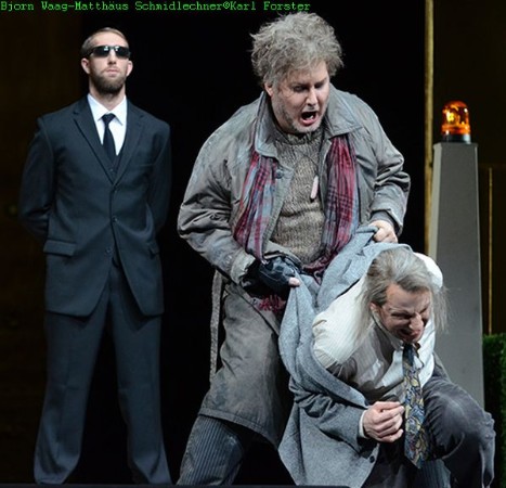 Aber so „menschenleer“ ist dieser Wald denn doch nicht, das erfahren wir spätestens im zweiten Akt im Inneren der Neidhöhle. Diese ist ein von dorischen Säulen zu beiden Seiten der Bühne flankierter Geldbunker mit Gittertor, in dem Fafner seinen Hort hütet. Alberich und Mime können sich nur durch eine Sprechanlage am Eingang mit dem „Wurm“ verständigen. Nach dem Kampf Siegfrieds mit dem Drachen, mit den üblichen Schablonen von Urweltungeheuren à la Tyrannosaurus rex aus Jurassic Parc, wird dann das Innere dieses Bunkers sichtbar. Bankier Fafner hat in seinem Imperium Neidhöhle offensichtlich eine ganze Armada beschäftigt. Natürlich sind zwei sonnenbebrillte Bodyguards in schwarzen Anzügen dabei und Bankangestellte in dezenter grauer Businesskleidung (Kostüme: Antje Sternberg). Den lästigen Paparazzi müssen sich Siegfried, der nun einen Anzug und die typische Richard-Wagner-Kappe trägt, und der Waldvogel einem Interview unterziehen. Nachdem Siegfried Mime getötet hat, erfolgt eine spannende Generalpause, in der das Publikum durch eine Einblendung erfährt, das der Komponist an dieser Stelle die Vertonung des Siegfried für zwölf Jahre unterbrochen hat, um sich der Komposition der „Meistersinger von Nürnberg“ und „Tristan und Isolde“ zu widmen. Danach stürmt Jung Siegfried, geleitet vom Waldvogel, dem Walküren Felsen entgegen…