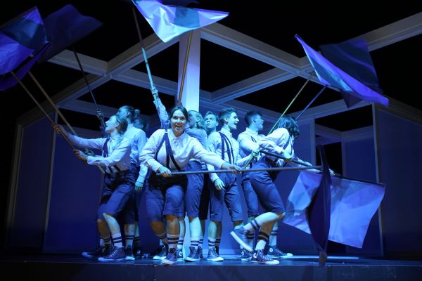 Für alle, die mit der Handlung nicht vertraut sind, nachfolgend die kurze und sehr gelungene Inhaltsangabe des Landestheater Linz: „Der Geschichtslehrer Ron Jones stößt in seiner Klasse beim Thema Nationalsozialismus auf Unverständnis. Die Jugendlichen können nicht verstehen, wie sich das faschistische Regime etablieren konnte und warum so viele Deutsche angeblich nichts vom Holocaust wussten. Er entschließt sich, ein Experiment durchzuführen. Er gründet „The Wave“, eine Organisation, in der die Schüler verschiedene Rollen übernehmen und sich strengen Verhaltensnormen unterwerfen. Die drei Prinzipien „Macht durch Disziplin“, „Macht durch Gemeinschaft“ und „Macht durch Handeln“ setzt er Schritt für Schritt um. Als die Dinge außer Kontrolle geraten und die eingeübten Strukturen immer totalitärere Züge aufweisen, will der Lehrer das Experiment abbrechen – doch die Mitglieder von „The Wave“ stellen sich ihm entgegen.“ Die gelungene Inszenierung von Christoph Drewitz konzentriert sich hierbei gekonnt auf den Lehrer Ron sowie die fünf Schüler Ella, Robert, Jess, James und Stevie. Während Jess und Stevie aus einem familiär durchaus prekären Umfeld stammen und diverse Probleme mit sich herumtragen, stammt James aus einem wohlhabenderen Elternhaus. Allerdings scheint es auch hier um die nicht materielle Zuwendung der Eltern nicht zum Besten bestellt zu sein. Zudem liebt James seine Mitschülerin Ella, die zu den besten Schülerinnen der Schule zählt. Und dann ist da noch Robert, der von allen nur gehänselt wird und der sich durch die Welle erstmals nicht komplett ausgestoßen vorkommt und hierdurch ein gefährliches Potential entwickelt. Verkörpert wird diese Rolle von Lukas Sandmann der diesen Charakter exzellent auf die Bühne bring. Auch die weiteren Darsteller wissen zu gefallen, Hanna Kastner spielt Ella, Celina dos Santos übernimmt die Rolle der Jess, James wird dargestellt von Samuel Bertz und Malcolm Henry verkörpert Stevie. In der Rolle des Lehrers Ron weiß Christian Fröhlich zu überzeugen. Abgerundet wird die Besetzung durch weitere 6 Ensemble-Darsteller, die weitere Schüler spielen und bei einigen Chorstücken und beim Bühnenumbau unterstützend eingreifen.