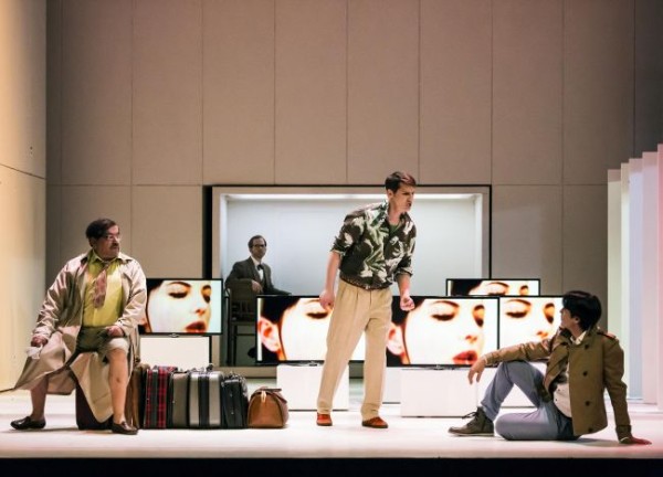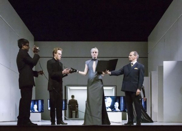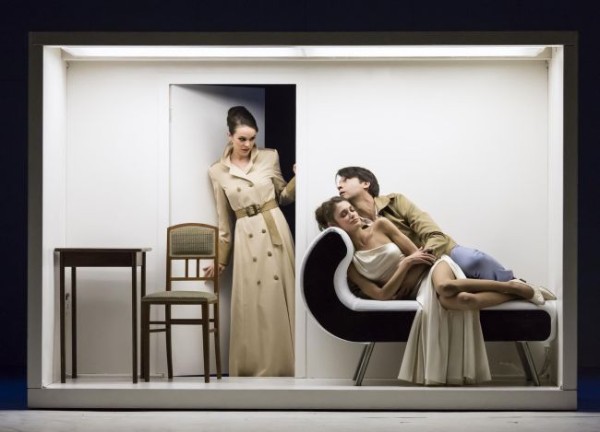Regisseur und Choreograph Jonathan Lunn nähert sich dem Stoff erfreulicherweise von einem modernen Ansatzpunkt aus. Es ist ihm hoch anzurechnen, dass er kein altbackenes, verstaubtes Barock-Ambiente auf die Bühne bringt, sondern dem Ganzen gekonnt einen zeitgenössischen Rahmen verpasst. Alexandra Burgstaller, von der auch die gelungenen Kostüme stammen, hat ihm einen kargen, nüchtern und steril anmutenden weißen Einheitsraum auf die Bühne gestellt, der von Wänden, Türen und einem riesigen Kastenschrank eingenommen wird. Mit Hilfe der Drehbühne sind schnelle Ortswechsel möglich. Das hier angewandte Baukastenprinzip ist durchaus überzeugend. In diesem visuellen Umfeld agieren die Handlungsträger in zeitgemäßen Klamotten wie Jeans, Pulli, schwarzem Lack und Leder. Die langen, fließenden Kleider der Damen haben einen recht erotischen Zuschnitt. Lunn gelingt eine treffliche Herausarbeitung der zwischenmenschlichen Beziehungen und Konflikte. Dabei wendet er auch Brecht’sche Elemente an. Der elegante Anzugträger Minos und sein Hofstaat betreten durch den Zuschauerraum die Bühne. Der Auftritt von König und Königin wird zu einem spektakulären Medienereignis, das von Kameras auf Bildschirme und Monitore übertragen wird. Auch sonst setzt der Regisseur vielfach ansprechende Filmprojektionen ein. Als Waffen dienen nicht altmodische Schwerter, sondern Pistolen. Die choreographischen Einlagen waren von modernem Ausdruckstanz geprägt. Überzeugend geriet auch der geistig-innovative Gehalt, den Lunn seiner Interpretation angedeihen ließ: Er deutet die Handlung als Selbstfindungstrip Ariadnes, als Reise in ihr verflochtenes Inneres, die schließlich ein neues Ich in ihr hervorbringt. Der Ariadne-Faden ist in Anlehnung an Sigmund Freud als Nabelschnur zu verstehen, den die Kretische Königstochter symbolisch durchtrennt, um am Ende mit Bacchus ein neues Leben beginnen zu können. Das alles war gut durchdacht und überzeugend umgesetzt.
