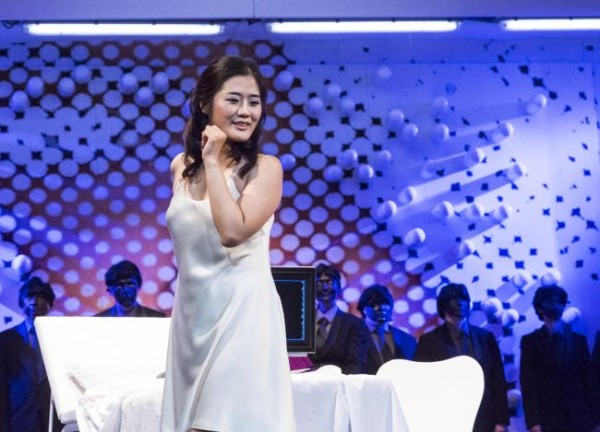 Einen modernen Zuschnitt wies die Inszenierung von Gastregisseur Amir Hosseinpour auf, der auch für die gelungene Choreographie verantwortlich zeigte. Er hat Verdis Oper zusammen mit seiner Bühnen- und Kostümbildnerin Andrea Hölzl in ein überzeugendes zeitgenössisches Gewand gekleidet. Frau Hölzl hat sich bei der Gestaltung des Raumes augenscheinlich von Damien Hirsts Kunstwerk „In this terrible moment“ inspirieren lassen. Wenn das Publikum den Zuschauerraum betritt, ist der Vorhang bereits geöffnet. Man erblickt eine riesige Apotheke mit integrierter Intensivstation, deren Wände von Regalen mit mannigfaltigen Medikamenten gesäumt sind. Letztere werden später auf dem ganzen Boden verteilt. Wenn sich im Lauf des Aktes die Hinterwand öffnet, erschließt sich dem Blick das Pixel-Bild eines weiblichen Gesichtes mit einem überdimensionalen Mund in kräftigem Pink. Dieses dem ältesten Gewerbe der Welt entsprechende Sinnbild sündigen Begehrens steht im Gegensatz zu einer echten, tief gefühlten Liebe. All die hier aufgereihten Arzneien vermögen indes das Leben der auf einer nüchtern anmutenden Krankenliege ihrem nahen Ende entgegensehenden Violetta nicht mehr zu retten. Sie befindet sich bereits an der Schwelle zum Tode. Dr. Grenvil und eine an ihrem Bett wachende Ärztin können nichts mehr für sie tun. Die Sinuskurve auf dem EKG-Gerät, an das Traviata angeschlossen ist, ist nur noch schwach. Sie liegt in den letzten Zügen und erlebt das Ganze als Rückschau. Alles spielt sich aus ihrer Perspektive ab. Sie erhebt sich vom Krankenbett und durchläuft mit ihren letzten Geisteskräften noch einmal ihre Vergangenheit.