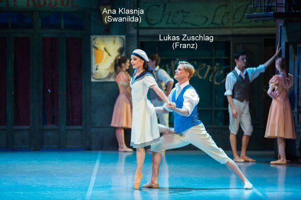 Die Laibacherin Ana Klasnja ist seit 2007 Solotänzerin des Hauses und war eine anrührende Swanilda – in zarter Zerbrechlichkeit, aber auch mit gebührender Autorität eine überzeugende Figur, die stets die Bühne beherrscht. Ihr Franz ist der aus Kärnten stammende Lukas Zuschlag , der ebenfalls seit 2007 Solotänzer in Laibach ist und der schon als 20-jähriger den Romeo getanzt hatte. Inzwischen hat er in Laibach auch als Sänger und Schauspieler geradezu einen „Promistatus“ erobert, wie eine Kärntner Zeitung schon vor über zwei Jahren in einem Artikel schrieb. Zuschlag war ein viriler Hauptdarsteller mit dynamischer Sprungkraft, aber auch mit lyrischer Leichtigkeit. Beide Protagonisten sind in den slowenischen Medien sehr präsent und wurden auch an diesem Abend vom Publikum im gut besuchten Opernhaus bejubelt. (Auch wenn man nicht Slowenisch kann, ist es nett, in ein Fernsehinterview hineinzuschauen, das die beiden aus Anlass der Premiere gegeben haben.)