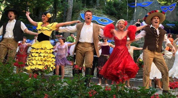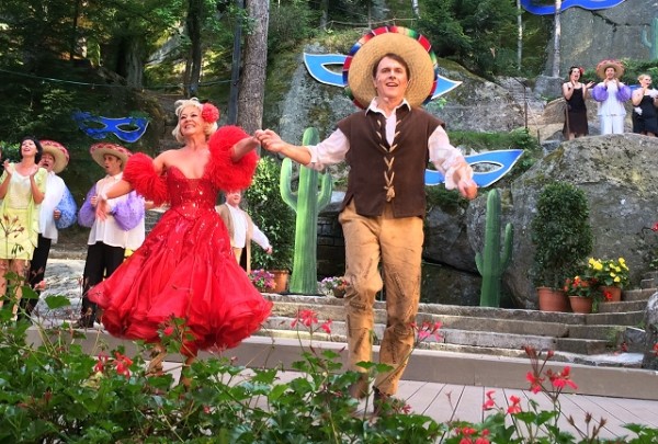 Bereits seit 1999, also nunmehr 16 Jahren kommt Heinz Hellberg mit der Operettenbühne Wien nach Wunsiedel und auch mit der heutigen Vorstellung beweist er wieder, warum er Jahr für Jahr eingeladen wird und vor praktisch ausverkauftem Haus spielen kann. Er lebt die Operette und bringt sie farbenprächtig, ausgelassen mit exzellenten Singschauspielern auf die Bühne, die die Welt bedeuten. Er modernisiert die Operette nicht um dem Zeitgeist zu folgen, er passt höchstens das musikalische Arrangement der jeweiligen Operette an. Gerade bei „Maske in Blau“ die ja sehr viele Melodien enthält, die man auch den Anfängen des Musicals zuschreiben kann, ist dies von besonderer Bedeutung. Er selbst schreibt in seinem Programmheft: „Ich schreibe Operette in Anführungszeichen, da für mich die Musik von Fred Raymond der Vorläufer zum heutigen Musical ist. Ein Mix aus klassischen Liedern, heißen Rhythmen und schlagerähnlichen Melodien. Deshalb habe ich auch das Orchestermaterial neu arrangieren lassen, um den Sound der Musik der heutigen Zeit anzupassen.“ Ein schönes Bühnenbild, die Erfordernisse der Felsenbühne ausschöpfend und mit wenigen Umbauten versehen, dafür mit einer Unzahl von blauen Masken, im Rund der Bühne verteilt. Adrian Boboc hat hier das Beste aus der Möglichkeit der Bühne geschaffen und die Kostüme von Lucya Kerschbauer sind verschwenderisch, stimmig und farbenprächtig. Allein die Juliska muss vier oder fünf Kostümwechsel – vielleicht sind es auch mehr gewesen – durchstehen und eines ihrer Kostüme ist schöner als das andere. All dies macht dem Auge Freude und bringt manchen spontanen Applaus in die Aufführung. Es wird auch insgesamt nicht mit Applaus gegeizt, auch daran kann man ersehen, wie sehr es dem Publikum gefallen hat, wie sehr es mitgeht und wie die Melodien einfach ins Blut gehen. Das Orchester unter László Gyükér ist erstmals in einem groß dimensionierten Orchesterhüttchen, oder wie immer man das nennen soll, untergebracht. Natürlich ist dies bei Regen für die Musiker – und auch die Instrumente – viel besser, aber ich hatte das Gefühl, dass der Klang dadurch etwas gedämpft zum Publikum durchdringt und nicht mehr so frei und ungebunden wie in den zurückliegenden 36 Jahren, die ich bereits die musikalischen Auftritte in Wunsiedel besuche. Trotzdem hat er das Orchester im Griff, lässt auch gerne einmal die Pferde galoppieren um sich bei den Gesangsauftritten doch wohltuend und sängerfreundlich zurückzunehmen. Hellberg hat das Orchestermaterial neu arrangieren lassen, dadurch klingt alles etwas frischer, schmissiger, voller Pep, vielleicht ein ganz kleines bisschen zu jazzlastig. Aber da stehe ich mit meiner Meinung praktisch allein da, das Publikum jedenfalls geht begeistert mit und applaudiert voller Begeisterung. Wenn man es so sagen möchte, hat Hellberg versucht die Grenzen zwischen klassischer Operette und Musical zu verwischen bzw. anzugleichen. Der Chor und vor allem auch das sehr stark geforderte Ballett sind ausgezeichnet und überzeugen voll. Für die vorzügliche Choreographie zeichnet Enrico Juriano verantwortlich, bei der Maske muss man Mioara Dumitrescu lobend erwähnen.