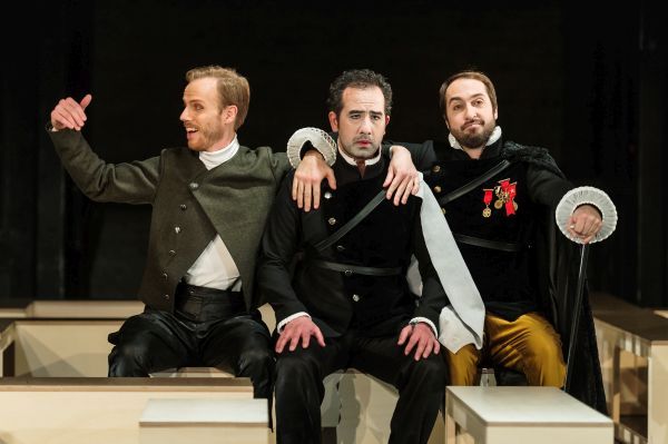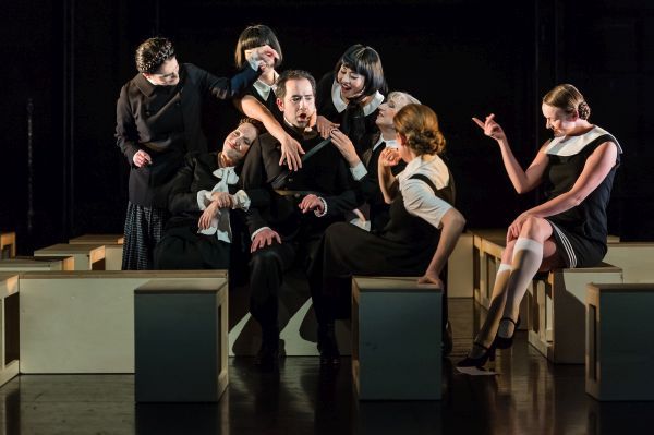 Witzig ist auch der Kostümmix von Nele Ellegiers: Vom spanischen Grande (Don Pedro) über die an Audrey Hepburns Kostüme in den Sechzigerjahre-Filmen erinnernde Héro, den grotesken Stummfilmkomiker (Somarone) bis zur matronenhaften Cio Cio San (Ursule) und der maskulin und mit Kurzhaarfrisur ausgestatteten Béatrice. Etwas steif wirkt die Inszenierung dennoch. Das liegt weniger an der Personenführung durch die Regisseurin Béatrice Lachaussée, welche von viel Einfallsreichtum zeugt, sondern an der allzu karg geratenen Bühnenausstattung von Werner Hutterli. In den nackten schwarzen Bühnenraum hat er eine Menge nüchterner, hohler Holzquader gestellt, welche anscheinend das Labyrinth eines französischen Gartens darstellen sollten, dessen Muster aber vom Parkett aus nicht zu erkennen ist. Immerhin geraten die Holzelemente dann im zweiten Akt etwas durcheinander, wenn das Chaos der Gefühle überhandnimmt. Trotzdem bleibt festzuhalten: Weniger ist nur manchmal mehr, nicht immer!