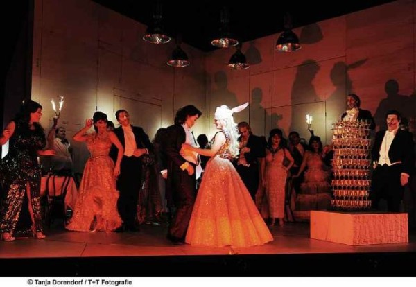 2013 wird das Verdi- (und Wagner-) Jahr werden, da die beiden Giganten der Opernliteratur vor 200 Jahren das Licht der Welt erblickten. Notgedrungen (u.a. Grösse des Orchestergrabens) werden sich die kleineren Häuser deshalb dem italienischen Maestro zuwenden und das Luzerner Theater bildet da keine Ausnahme, ja es reiht sich sogar stolz in die Reihe der Häuser ein, welche bereits in den ersten Januar Wochen mit einer Verdi-Premiere aufwarten. Die Verantwortlichen haben sich dabei nicht für eine der seltener gespielten Jugendopern Verdis entschieden, sondern sich mutig daran gemacht, eine der meistgespielten und bekanntesten Opern aus der Feder des Komponisten, LA TRAVIATA, zu präsentieren, sie auf ihre Relevanz für die Gegenwart zu erforschen. Das Luzerner Premierenpublikum liess sich erstaunlich interessiert, gelassen und am Ende gar begeistert auf diese Reise mitnehmen, obwohl ihm das Inszenierungsteam (Regie: Lorenzo Fioroni, Bühnenbild: Werner Hutterli, Kostüme: Sabine Blickenstorfer) diese Reise nicht einfach machen wollte. Verabschieden musste man sich von Bildern und Kostümen aus der Zeit des Bürgerkönigs, welche vielleicht von Visconti- und Zeffirelli-Inszenierungen oder Verfilmungen noch im Kopf herumschweben mochten. Bereits bei den ersten Klängen der Ouvertüre, den so eindringlichen Reibungen der geteilten Violinen, welche das Leidmotiv Violettas darstellen, machte sich der Hang des Regisseurs zu Gags bemerkbar, indem ein Kellner versuchte, einen riesigen Turm von gefüllten Champagnergläsern über die Bühne zu tragen – und auch prompt Applaus erntete, als er es schaffte. Szenenapplaus mitten im Vorspiel zu LA TRAVIATA – das hat es wohl noch nie gegeben. Also gar nichts für Puristen. Genau zum Einsetzen der m-ta-ta Begleitfiguren begann sich die Bühne zu drehen (Leierkastenmusik, der ungerechtfertigte Vorwurf, den sich Gegner Verdis oft erlaubten, wurde hier zur illustrierenden Karussellmusik) und die frivole Gesellschaft beginnt die Schläge zu zählen, es ist Silvesternacht. Dann geht die lärmige Fete los, die Damen tragen all ihre Reize zur Schau, erinnern mit ihren gigantischen Busen an Russ Meyers SUPERVIXENS. Da können sich die Herren (ganz luxuriös besetzt mit Stützen des Luzerner Ensembles: Robert Maszl als Gastone, Marco Bappert als Douphol und dem markanten Bass von Szymon Chojnacki als d’Obigny) natürlich nicht zurückhalten und holen auch schon mal ihre ebenso gigantischen männlichen Attribute aus dem Hosenstall.