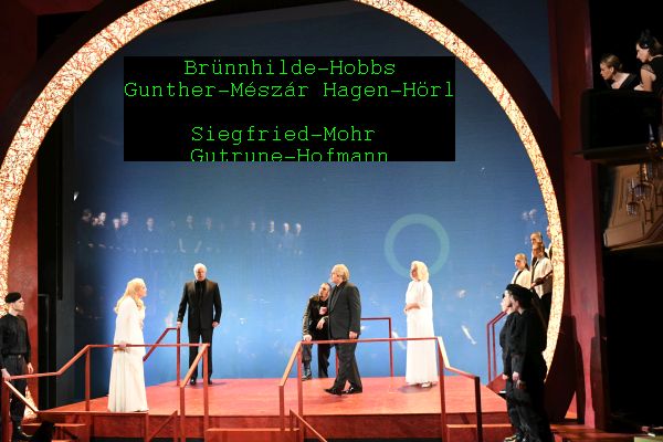 Früher als Wotan und jetzt in der undankbaren Rolle des Gunther war Renatus Mészár neben Thomas Mohr der meistbeschäftigte Sänger des „Ring“. Darstellerisch und stimmlich wandelte er sich vom Prahlhans zum verzweifelten Spielball von Hagens Intrige, sodaß das Verdi-ähnliche Rache-Terzett mit Brünnhilde und Hagen im zweiten Aufzug ein musikalischer Höhepunkt wurde. Magdalena Anna Hofmann – Sieglinde in der „Walküre . war stimmlich und darstellerisch eine passende Gutrune, die wohl vor Siegfried ein Verhältnis mit ihrem Bruder Gunther hatte. Zum Schluß wurde auch sie vom Bruder Hagen umgebracht.