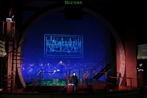 Jetztzeit zeigte auch die Nornen-Szene – alle drei auch in Schwarz -, die ihr Seil mit Hilfe von Tablets schwangen, was auf dem bekannten Video-Viereck über der Bühne zu sehen war. (Videogestaltung wiederum Matthias Lippert) Zwischen den Darstellungen des Seils erkannte man dort Runen, vielleicht auch Algorithmen, die sich zum Ende des „ewigen Wissens“ auflösten. Auch die Rheinfahrten zwischen Brünnhildes Felsen und der Halle der Gibichungen oder die „starken Scheite“wurden dort angedeutet. Weitere Videos erinnerten an passenden Stellen an die vorigen „Ring“ – Teile, etwa Stacheldraht-Knäuel, fallende Felsbrocken oder auch die Hunde und Pferde aus der „Walküre“