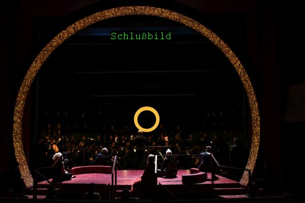 Danach war es passend, daß bei Brünnhildes Abschied nur zwei Fackeln tragende Statisten das verzehrende Feuer andeuteten. Nach der Entsühnung des Rings durch die Rheintöchter mit Hagens Tod wurde der endgültige Untergang Walhalls durch das jetzt wieder voll sichtbare Orchester nur akustisch dargestellt wurde mit immer hellerem Licht von oben (Michael Kohlhagen), szenische Lösungen schaffen kaum, was die Musik erzählt. Dazu traten zum abschliessenden „Erlösungsmotiv“ alle Mitwirkenden zunächst unerkannt auf die Bühne und bildeten mit dem Chor auf der Empore wohl die von Wagner vorgeschriebenen „Männer und Frauen“.
