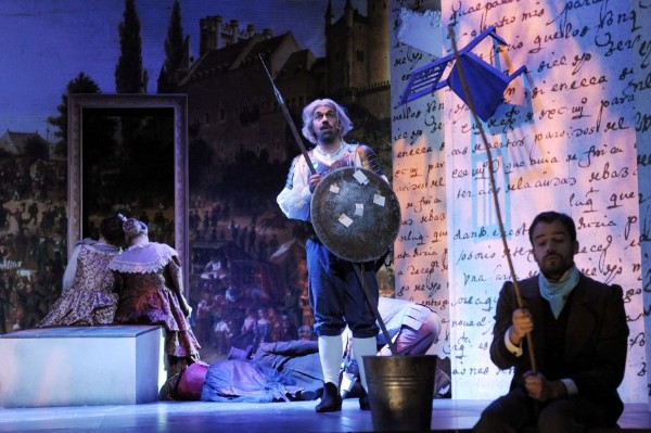 Mit der szenischen Umetzung hat man Kristina Wuss betraut, die die tragigkomische Geschichte mehr oder weniger als eine Art Reise durch die Jahreszeiten erzählt. Auf der kleinen Freiberger Bühne hat Tilo Staudte, der auch für die mit großer Liebe zum Detail gestalteten Kostüme verantwortlich zeichnet, Handschriften von Cervantes auf Wände gezogen, Gemälde aus dem 19. Jahrhundert bilden den Hintergrund für die Szenerie, in dem Cervantes selbst und Leser des Romans aus dem 17. Jahrhundert als stumme Rollen auftreten und somit den Rahmen für die Erzählung bilden. Leider hält die Regisseurin diesen doch recht traditionellen Ansatz nicht stringent durch und streut moderne Requisiten ein. Eine herumliegende Computertastatur, ein Doppeldeckerflugzeug im Rundflug und die Darstellung der Räuberbande als US-amerikanische Cowboys sind aber weder besonders originell noch sinnstiftend und bleiben deshalb bloße Regiemätzchen. Nicht zuletzt wegen des wunderbar variantenreichen und stimmungsvollen Lichtes von John Gilmore gelingen aber bewegende und anrührende Bilder, die am Ende eine gelungene szenische Umsetzung von Massenets Oper möglich machen.