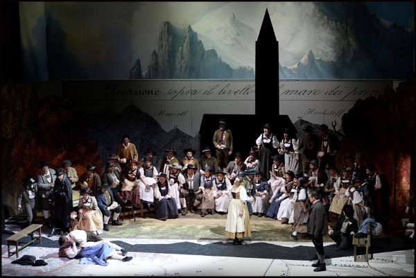 Am gestrigen Samstag präsentierte das Haus eine Koproduktion mit dem Grand Théâtre de Genève. Alfredo Catalanis recht selten gespielte Oper „La Wally“ wird hier ohne jegliche Aktualisierung gegeben (nach meiner letzte Begegnung mit diesem Werk in einer unsäglichen Lesart von Tilman Knabe am Nationaltheater Mannheim, in der Wally über 40 Jahre vom Hippie zur alkoholkranken Firmenchefin wird und den letzten Akt nur als Suff-Vision erlebt, eine echte Wohltat). Und doch wird der Opernabend, der auf der „Geierwally“-Vorlage von Wilhelmine von Hillern basiert, aufgrund der ausgefeilten Personenführung von Cesarie Lievi nie langweilig. Seine Bühnenaufbauten wurden der kleineren monegassischen Bühne angepasst – und das tut der Inszenierung gut. So entsteht vor Postkartenidyll eine kleine Welt in den Ötztaler Alpen, in der sich die Gutsherrntochter Wally gegen den Vater auflehnt und, vom Geliebten in aller Öffentlichkeit brüskiert, in die einsame Bergwelt zurück zieht. Der Wiedervereinigung der Liebenden kommt – im Gegensatz zur Romanvorlage – eine Lawine dazwischen, die den Angebeten in die Tiefe reißt. Wally stürzt sich verzweifelt in den Abgrund nach. Die liebevoll gestalteten Kostüme von Ezio Toffolutti sind voller Lokalkolorit und machen zusammen mit dem stimmungsvollen Licht von Roberto Venturi den Abend rund. Es ist also, was den Rahmen und die Inszenierung betrifft, ein Opernbesuch wie vor hundert Jahren – und so gesehen ein wirkliches Erlebnis.