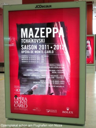 Monaco mit seinen etwas über 30.000 Einwohnern verfügt über ein eigenes Opernhaus, das sechs bis sieben Produktionen im Jahr insgesamt etwa 30mal spielt. Das Theater befindet sich im Komplex des Spielcasinos in der 1874 erbauten Salle Garnier (des gleichen Architekten, der die Pariser Oper Palais Garnier erbaut hat), einem prunkvollen, kürzlich wieder völlig restauriertem Saal mit etwa 560 Plätzen. Bei der Aufführung des Mazeppa handelt es sich um die Übernahme einer Koproduktion mit der Opera Ireland, wo das Stück 2009 herauskam.