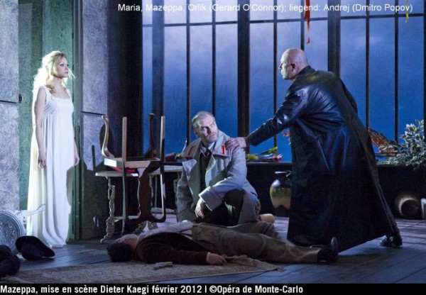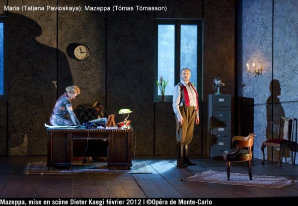 Späte Anflüge der Grand’opéra sind in Mazeppa allgegenwärtig. Das spiegelt sich auch in der Musik wider, die in ihrer plakativen programmatischen Oberflächlichkeit nicht unter die Haut geht. Auch die Ausdeutung der Partitur durch den Tschaikowsky-Spezialisten Dmitri Jurowski am Pult, ändert daran nichts. Wieder einmal wird holzschnittartig gezeichnet, wozu allerdings das Orchestre Philharmonique de Monte Carlo perfekt intoniert. Der Opernchor wirkte nicht ganz präzise und hatte offensichtlich Probleme mit der Aussprache des Russischen. Die wogend dramatische Bewegungsregie des Chors wog das aber mehr als auf. Kaum Ausspracheprobleme hatten die Solisten, denn das waren überwiegend Muttersprachler, denen die Sprache glatt und gefällig über die Zunge lief. In der Titelrolle sang allerdings der Isländer Tómas Tómasson stimmgewaltig mit etwas rauem Bariton, der die Rolle auch schauspielerisch idealtypisch verkörperte.