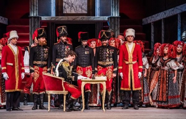 Ulrich Wiggers hat bisher vor allem viel Musical inszeniert, aber diese Arbeit zeigt, er kann auch Operette sehr gut ! Was natürlich auch am gesamten Team liegt, denn Leif-Erik Heine als Ausstatter ist einfach ein Gewinn, sein Bühnenbild zeigt mit wenigen Veränderungen und flotten Umbauten den Budapester "Grill Americaine", das schäbige Adelsschloß, dann später zeitgemäß renoviert durch die Amerikaner, ohne das es dem Auge langweilig wird. Seine Kostüme sind einfach eine Augenweide: die übliche Husarenuniformen, die Zwanziger Jahre Mode und die schon etwas (herrlich) verschrobenen slawischen Hoftrachten. Und die wirklich witzigen vielen Figurinen für das Ballett. Überhaupt das Ballett kommt viel zum Einsatz, ebenso wie das eingebundene Ensemble in den unterhaltsamen Choreographien von Kati Heidebrecht. Aber eben auch die Spielleitung von Ulrich Wiggers, denn das Libretto kann, voll ausgespielt, über vier Stunden dauern (Osnabrück vor einigen Jahren); die Uraufführung soll 1928 übrigens an die fünf Stunden gedauert haben. Wiggers bleibt unter drei Stunden, ohne Striche in der Musik und ohne das man etwas in der Handlung vermißt.