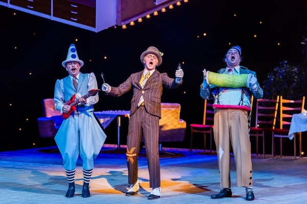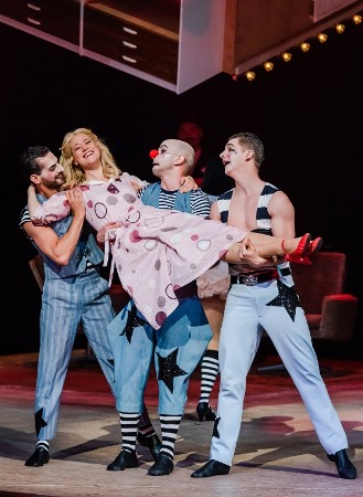 Viele „Schlager“, die ins Ohr gehen, hat das Stück nicht, obwohl es insgesamt eine ganze Reihe von Musiknummern gibt. Dies alles wird aber überlagert von dem Lied der Iduna „Oh mein Papa war eine wunderbare Clown …. Und die Krone soll an dieser Stelle auch der Darstellerin der Iduna gehören, der in Neustadt/Aisch geborenen Sopranistin Ruth Ingeborg Ohlmann. Um es gleich vorweg zu nehmen, sie ist eine ausgezeichnete Iduna und es wäre sehr zu wünschen, wenn sie öfter als Gast zur MuKo eingeladen werden würde. Mit leuchtendem, höhensicherem Sopran, der musikalisch jede Nuance ausfüllt und einem exzellenten Spiel macht sie diese Rolle zum Fixpunkt der Aufführung. Es ist nicht nachvollziehbar, wie diese Ausnahmekünstlerin in einem guten Tag, dies so auf die Reihe gebracht hat. Das Publikum jedenfalls spendet nicht nur reichlichen Beifall, nein, es trampelt wie wild und bringt damit seine Wertschätzung dieser außergewöhnlichen Leistung zum Ausdruck. Und die zweite Krone gehört an diesem Abend der Darstellerin der Anna, der in Coburg geborenen und seit nunmehr 5 Jahren an der MuKo befindlichen Sopranistin Nora Lentner. Sie verzaubert mit girrendem, klarem, höhensicherem Sopran, der auch zart zu vielen Facetten fähig ist. Sie ist nicht nur reizend anzuhören, sondern auch anzusehen. Dazu kommt eine überschäumende Spielfreude, die sich auch auf die anderen Darsteller überträgt. Die ehemalige Stipendiatin der Deutschen Johann Strauss Gesellschaft hat bisher ihren Weg gemacht und dieser ist mit Sicherheit noch nicht zu Ende. Aus dem insgesamt homogenen Ensemble stechen an diesem Abend noch der in Poznan in Polen geborene Radoslaw Rydlewski hervor, der einen schlanken geschmeidigen Tenor besitzt und der an diesem Abend auch eine überschäumende Spielfreude auf die Bühne bringt. Er lebt diese Rolle als Onkel Gustav sichtlich aus, ebenso wie der in Leipzig geborene Bariton Milko Milev, der neben einem feinen kräftigen und gesunden Bariton eine ausgesprochen humoristische Ader besitzt und aus der Partie des Onkel Fritz alles herausholt und sich richtiggehend in die Rolle hinein wirft. Die Mutter wird von Angela Mehlig gegeben und die in Halle an der Saale geborene Künstlerin, die seit 1983 an der MuKo beschäftigt ist, füllt die Rolle sichtlich aus. Ebenso wie ihr Mann (natürlich nur im Stück), der aus Herisau stammende Bariton Michael Raschle. Als Alexander Obolski steht der in Ehst in Nordfriesland geborene Bariton Hinrich Horn auf der Bühne und auch er füllt die Rolle des Westemporkömmlings beeindruckend aus. Als Robert, Freund von Anna bringt Justus Seeger alles. Der aus Krefeld am Niederrhein stammende Bariton wirft sich in die Rolle, für mich stört die doch etwas unvorteilhafte Frisur schon sehr. Tante Paula wird von der aus Weimar stammenden und seit 1982 an der MuKo beschäftigten Anne-Kathrin Fischer rollendeckend gegeben. Tante Berta wird von der in Berlin-Friedrichshain geborenen Mezzosopranistin Carolin Masur mehr als rollendeckend dargeboten. Tante Lisa ist die in Lund/Schweden geborene Dagmar Zeromska, die seit dieser Spielzeit im Chor der MuKo tätig ist und hier ihre Sache als Solistin ordentlich abliefert. Onkel Heinrich schließlich ist der Wiener Andreas Rainer, der seit 19 Jahren an der MuKo tätig ist und seinen schönen Tenorbuffo wohltönend einsetzt. Als Köchin schließlich die in Rudolstadt geborene Sabine Töpfer, die als Erzkomödiantin seit 29 Jahren Mitglied der MuKo ist. An diesem Abend hat sie stimmlich ein kleines Problem, deshalb entfällt leider das „berühmte“ Lied der Köchin. Darstellerisch zieht sie komödiantisch vom Leder und hat den Applaus des Publikums sicher. Wenn man im zweiten Akt die drei Tanten nicht in Raubtierkostüme gesteckt und sie fauchend über die Bühne geschickt hätte, was für mich schon einen kleinen peinlichen Beigeschmack hat, wäre an der Aufführung fast nichts auszusetzen gewesen.