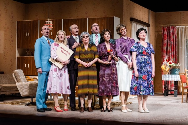 Die Inszenierung stammt von Axel Köhler und er lässt das Stück in Leipzig im Herbst 1989 spielen. Es ist sein Regiedebüt an der MuKo und die Idee, die Handlung in die Zeit vor der Wende zu verlegen ist überlegenswert. Er stellt die etwas betuliche spießbürgerliche Welt dem reichen Westonkel gegenüber, der wie ein Orkan in die kleine Welt unter den Augen von Erich Honecker (als Wandbild) stürmt und fast alles durcheinanderbringt. Nun gut, so etwas kann man machen, die Pointen und Anspielungen werden sicher aber nur von ehemaligen Bewohnern der DDR richtig verstanden, Jüngere und auch Theaterbesucher aus anderen Bundesländern tun sich da schon etwas schwerer, die Pointen zu begreifen. Die Einrichtung des Wohnzimmers ist wunderbar im Stil der damaligen Zeit gehalten, alles mit dem dazugehörigen Inventar. Und mit sehr viel Liebe auch zu den kleinsten Details haben hier Okarina Peter und Timo Dentler, die für die Bühne und die Kostüme zuständig sind, gearbeitet.