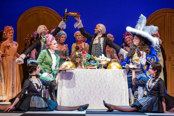 Mirko Mahrs Choreographie fängt auf sehr erfreuliche Weise die Musik auf. Insgesamt bleibt mir die Szene mit modernisierten Habitus doch sehr konventionell und bieder. Der letzte Akt rutscht dann schon in ziemlichen Slapstick und Klamauk, der jedoch funktioniert, weil mit Milko Milev (König), Justus Seeger (Maurepas) und Andreas Rainer (Calicot), drei Komiker am Werke sind, die Disziplin auf das Feinste mit einem perfekten Timing beherrschen. Andreas Rainer ist zudem ein wunderbarer Tenorbuffo, der dem Revolutionsdichter eine prima Vokalstatur verleiht.