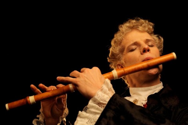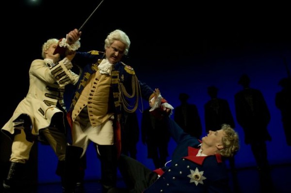 Und dann waren da noch der ebenso überzeugende, geradlinige Maximilian Mann als Leutnant Hans Hermann von Katte, der zu Friedrichs einzigem echten Freund wird und Elisabeth Hübert als Friedrichs sonnige Schwester Wilhelmine. Die Beiden spielten nicht unwesentliche Rollen und wurden außerdem in eine zarte Romanze verwickelt. Dazu kontrastierend wurden August der Starke (Petter Bjällö) und der Schrifsteller Voltaire (Léon van Leeuwenberg) als nicht ganz ernstzunehmende Zeitgenossen in Szene gesetzt. Ihre Showeinlagen peppten das Drama auf und waren inspiriert vom lustigen Dresdner Hofleben und der „kleinen heilen Welt“ der Dichter und Denker auf Schloss Sanssoucie. Schön war, dass diese Nummern doch nie den Bezug zur Tragik der Geschichte verloren – zum Beispiel, wenn Friedrich einen verhalten kritischen Gesprächspartner anherrscht, dass hier über alles diskutiert werden dürfe – außer Politik!