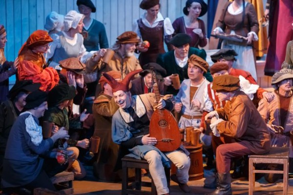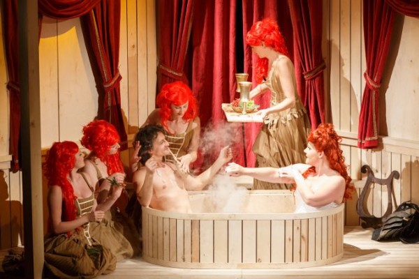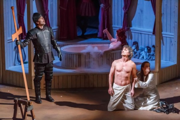 Der Intendant des Erzgebirgischen Theaters hat die Inszenierung vorgenommen. Dabei hält er sich dankenswerterweise ganz eng am Libretto, so dass sich der Zuschauer nicht mit stofffremden Deutungsversuchen konfrontiert sieht. Die Handlung des Tanhäuser verläuft ziemlich linear ohne größere Verwicklungen. Der Ausstatter Tilo Staudte stellt als Bühnenbild eine einfache Burg aus Holz auf einem Drehteller zur Verfügung. Die ist zunächst für das Volksfest in Eisenach gedacht, eröffnet aber nach Drehung den Blick auf den Sündenpfuhl im Hörselberg. Tannhäuser und Venus, letztere umgeben von einer ganzen Reihe rothaariger Miezen, fühlen sich wiederholt in einem großen dampfenden Badezuber wohl: mittelalterlicher Badekomfort statt Massagesalon. Das gemeine feiernde Volk ist in einfache ans Mittelalter erinnernde Kostüme gesteckt, Tanhäuser und sein Gefolgsmann Eckart in Rüstungen. Innigis‘ unschuldiges Wesen zeigt sich durch ihr weißes Kleid. Auf der kleinen Bühne mit Chor und Extrachor und einem kleinen Ballett, herrscht nicht viel Platz für Bewegungsregie. Urbanus, Patriarch von Jerusalem steht hoch über der Bühne in einem Turm und schleudert Tanhäuser den vertrockneten Stab entgegen. Wie an dem keine Rosen mehr erblühen können, kann auch Tanhäuser keine Begnadigung erfahren. Anders als bei Wagner wird diese Szene gespielt und nicht erzählt. Tanhäuser kehrt aber tatsächlich (wie bei Heine) zu Frau Venus zurück. Erlöst wird der in dieser Version durch die aufopfernde Liebe der Innigis. (Das ist ja gar nicht mal so weit weg von Wagner.) Und natürlich blüht die Rose dann doch auf… Diese Inszenierung ist gut anzuschauen und ermangelt nicht eiger Feinheiten und Anspielungen.