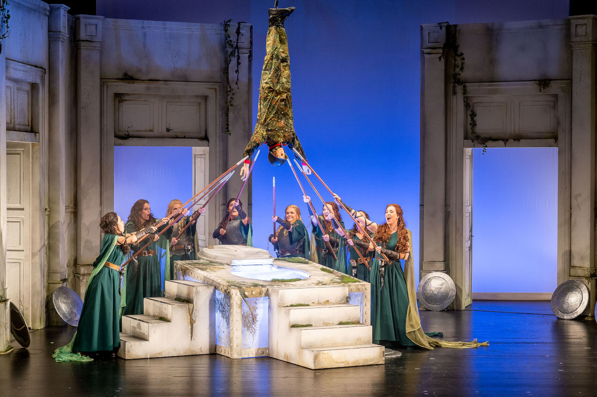 Aber ist es nicht erstaunlicher, dass alle Partien vom Haus besetzt werden können? Juha Koskela singt die geheime Hauptrolle der Tetralogie. Ich gebe zu, dass ich mich an die Stimme seines Wotans gewöhnen musste – erst im dritten Akt hatte er bzw. sie mich. Vorher tendierte sein finnisches Stimmorgan zu einem milchig-mulchigen Klang, der gegenüber der äußersten Verständlichkeit zumal von Peggy Schäfer und Jessey-Joy Spronk seltsam abstach (dass vermutlich nicht wenige Besucher, auch dann, wenn die beiden Damen sangen, die Übertitel mitlasen, um die Szene nur bruchstückweise mitzubekommen, mag an der Tatsache liegen, dass ein Ring in Bad Elster eine theaterhistorische Tat ist). Erinnerte er eine Freundin äußerlich an Hape Kerkeling, also eine Parodie, so musste ich gelegentlich an den amtierenden Direktor des Bayreuther Richard-Wagner-Museums denken… ein Zufall, aber ein hübscher. Insgesamt hat Koskela, der, man glaubt es nicht, seit 20 Jahren am Harztheater engagiert ist, seinen Riesenpart mit seiner immensen Erfahrung bis in die letzten Takte von Wotans Abschied realisiert, die Tochter leicht inzestuös in den Schlaf küssend. Bleibt die Göttergattin der Regina Pätzer, deren Stimme, wie der verzweifelte Wagnerianer Thomas Mann geschrieben hätte, „ganz mit historischem Edelrost“ überzogen scheint. Das Walküren-Oktett klang cum grano salis homogen, was einzelne herausragende Profile nicht unterdrückte. Und der sozusagen altgermanisch auftretende Hunding, Repräsentant einer alten Gesellschaft, von Beruf Schmied und Krieger, ist mit dem Bassbariton Samuel Berlad so wortdeutlich besetzt, dass das Musiktheater auch bei ihm verwirklicht wird.