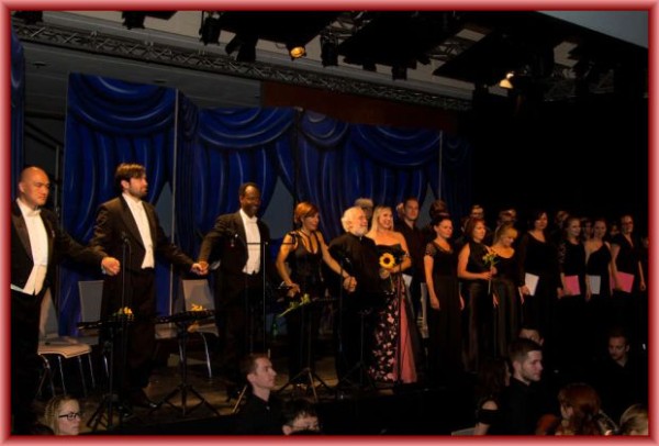 Dirigent Gianluigi Gelmetti – zwischen Laura Polverelli und Silvia Dalla Benetta – wurde nach der Aufführung und seiner Auszeichnung mit dem Ehrenpreis Rossini in Cima vom Publikum minutenlang gefeiert (Copyright: Belcanto Opera Festival Rossini in Wildbad)