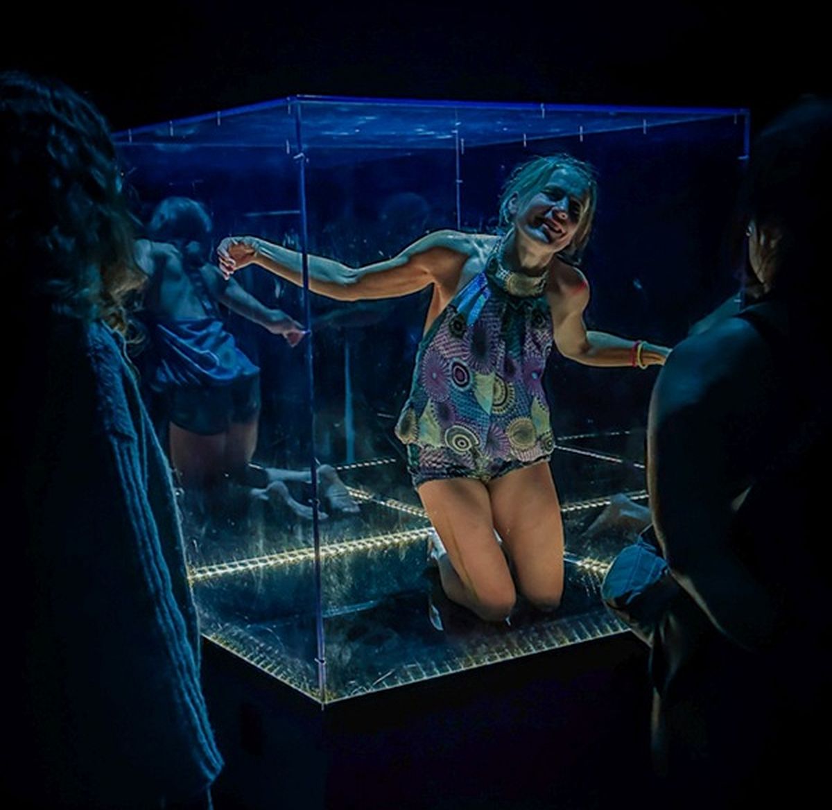 Das Über-Ich, unsere inneren Moralvorstellungen, Werte und Ideale, geprägt durch Erziehung und Sozialisierung, tanzt in einem plexi-gläsernen Würfel und nur leicht bekleidet (Leonie Wahl). Verführerische und verlockende Gesten, direkte Ansprache der „Außenstehenden“. Sie geht ins Spüren momentaner und konsolidierter Befindlichkeiten, auch oder sogar insbesondere der Schuldgefühle, spiegelt diese, provoziert auch jenes „Das gehört sich nicht“ der internalisierten Moralvorstellungen. Wunderbar.