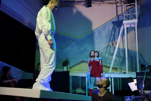 Der Politgaukler benutzt die Gewalt zur Sättigung eigener Lüste, was unbedeutend wäre, würden sich damit nicht die Schicksale ganzer Völker verbinden. Des Diktators „Ethos“ – nennen wir es so – schwankt zwischen Nihilismus, Größenwahn und einem falsch verstandenen Heroismus: „Gewalt reizt Gewalt, und die stärkere siegt. Das Gesetz meines Lebens und meiner Einsamkeit. Gefahr zu suchen und zu bändigen. Großes zu bewegen und den Menschen meinen Willen aufzuzwingen.“ Musikalisch entlädt sich diese Sprache in auffahrenden Gesten, in den Duetten mag ein pardierter Puccini nicht fern sein, eine angedeutete Atonalität verschrägt das Ganze, nicht allein am Ende triumphiert die Dissonanz. Wie gesagt: Wenn der Zuhörer alles verstünde… denn hier steht es schlecht. Da insbesondere beim Diktator, also Lawrence Halksworth, die Verständlichkeit gegen Null tendiert, auch die anderen Protagonisten, wenn sie im kleinen Raum dynamisch überdrehen, das Verständliche in irgendeinen Hallraum gerät, nimmt das tiefere Interesse an den wahren Konflikten beim Zuschauer, der es genau wissen will, vermutlich schon bald ab. Kommen hinzu die Texte, mit denen die Produktion die nur 26 Minuten lange Originaloper mit und ohne Musik angereichert hat. Etliches bleibt ein Rätsel: Soll das Lyrik sein? Ist es Dokumentartheater? Was will man uns sagen? Man ahnt es mehr als dass man es aus dem Mund der Protagonisten erführe, die sich doch mit vollem körperlichen und vokalen Einsatz in die gewiss verdienstvolle, politisch relevante Angelegenheit werfen. Wenn Eva Maria Nikolaus, die Charlotte des Abends, einmal mit dem falschen Fuß auf dem Boden aufkommt, weil sie die Schräge der herabgelassenen Wippe unterschätzt hat, die Sängerin aber unverdrossen weitersingt, als sei nichts geschehen, erschrickt man einen Moment. Wie gesagt: Voller Einsatz, auch bei der Maria der Isabel Reinhard, die sich einmal in einen seltsamen Pas de deux mit ihrem kranken Offizier begibt. Auch Sotiris Charalampous singt ansprechend, aber am besten in Ausdruck und Stimmgeschmeidgkeit fand ich doch die Diktatorenfrau. Soviel Verführung (des Rezensenten) muss schließlich sein.