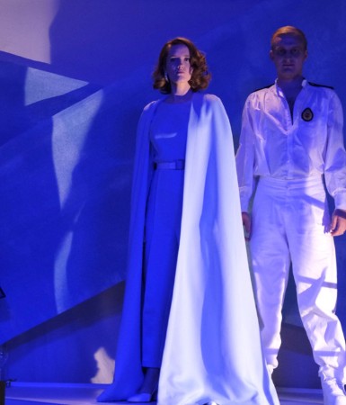 Worum geht’s? Barbara Zuber hat im Münchner Programmheft einer der ganz wenigen Inszenierungen der letzten Jahre die knappe Handlung knapp zusammengefasst: „Es handelt sich um die Fehde einer jungen Frau namens Maria, die ihren Ehemann, einen durch eine Kriegsverletzung erblindeten Offizier, rächen und den allein an seinem Unglück schuldigen Diktator töten will, von diesem jedoch verführt wird. Am Ende hat sich alles umgekehrt. Als Charlotte, die eifersüchtige Gattin des Potentaten, ihren Mann erschießen will, wirft sich Maria dazwischen und stirbt anstelle des Diktators.“ Krenek hat Ende der Zwanziger Jahre einen konkreten Diktator vor Augen gehabt: den Duce, also Benito Mussolini. Der Diktator der Inszenierung von Ariane Kareev tritt in einem (von Julia Denzel entworfenen) Kostüm auf, das ein bisschen futuristisch anmutet, freilich auch an die Zukunftsvisionen, die in der Entstehungszeit des ersten der drei als Einheit konzipierten Einakter en vogue waren. Dem Programmheftchen liegt nicht zufällig ein Einlegeblatt mit einem Ausschnitt aus Marinettis Manifest des Futurismus bei. Zukunft aber scheint immer zu sein, wo die Gegenwart und die Verführungskraft durch den Populismus – dies das eingestandene Grundthema der Inszenierung – so übermächtig sind. Scheinhaft aber sind schon die blauweißen, wie von Wolkennebeln durchzogenen Bänder, die sich von der Bühne in den Zuschauerraum ziehen. Der Bühnenentwurf Lina O. Nguyens suggeriert eine Idylle, die seinerzeit nicht einmal mehr in der Schweiz zuhause war, in der der bezeichnenderweise namenlose Diktator mit seiner gleichsam gelind futuristisch gewandeten Gattin Urlaub macht.