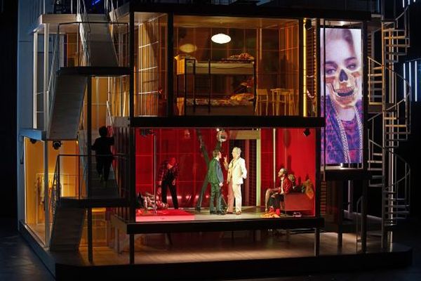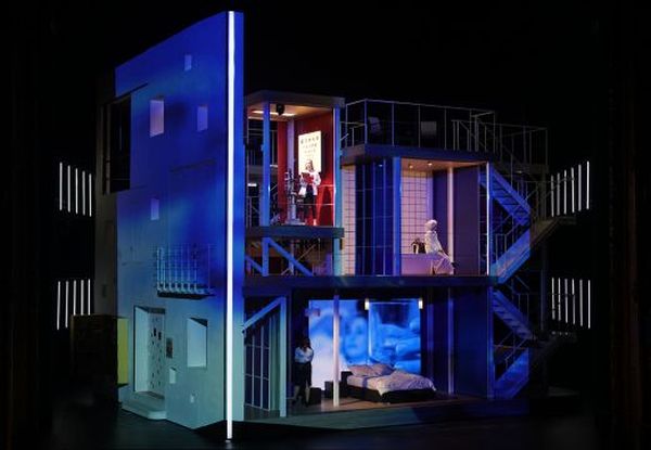 Alles Dargebotene ist wunderschön, sehr interessant und hochkomplex. Und zwar so komplex, dass sich niemand ohne entsprechende Verständnishinweise in der Vielzahl von Handlungssträngen zurecht finden könnte. Einen Schlüssel zum Verständnis finden wir in drei Farben, eine Farbe für jedes Stück, die uns verraten, wo die entsprechende Szene einzuordnen ist. Das adelige Blau repräsentiert die Welt der Almavivas; Gelb, die Farbe des Neides und der Lüge steht für Lügen- und Inriegenspiels Cosi fan tuttes; Sex und Crime, die Welt des Don Giovanni, erleben wir in Rot. Dabei erkennen wir an der farblichen Grundstimmung der Bühne und der Kostüme, welches Stück wir gerade sehen, wie wir auch an der farblichen Gestaltung der einzelnen Räume des Gebäudes und der in diesem Moment zur Nebenfigur der Kernhandlung gewordenen Sängerdarsteller die Überschneidungen der Handlungsverläufe zuordnen können. Räume mit mehrfacher Zuordnung erscheinen gestreift; die alles verbindende, alles erkennende und alles durchschauende Concierge trägt ein blaues Kleid, rote Schürze und gelbe Schuhe und Gummihandschuhe.
