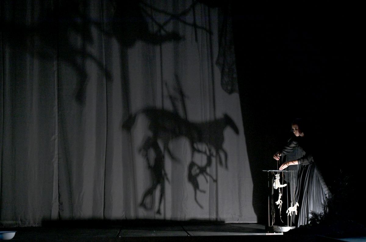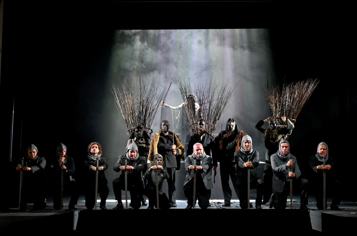 Zunächst irritiert durch diese weitere Verringerung der ohnehin schon wenigen Plätze, überzeugte mich die Regie von Manuel Renga bald von dieser Notwendigkeit, denn die das Orchester umschließenden Stege wurden optimal genutzt. Damit hatten die Hexen in ihren schwarzen Umhängen mit überdimensionalen Kapuzen (Bühnenbild und Kostueme: Aurelio Colombo) auf der Minibühne genügend Raum, um ihre Aktivitäten zu entfalten. Ihre Auftritte sind ausgezeichnet gelöst, denn ihre Ausstrahlung entspricht nicht Märchenhexen, sondern vermittelt den Eindruck von Parzen, schneiden sie doch die Schicksalsfäden immer wieder durch. Gekonnte Schattenspiele suggerieren König Duncans Einzug zu Pferd, wie der Beleuchtung von Emanuele Agliati überhaupt große Bedeutung zukommt. Eindrucksvoll die Bewegungen der fuer Bancos Beseitigung eingesetzten Meuchelmörder, die – wie Macbeths Getreue im letzten Bild – um Hals oder Kopf Teile von Kettenhemden tragen. Über Bancos Geist ragt ein schreckerregender Widderkopf, der von drei Tänzern gehandhabt wird. Die Bankettszene (mit den Choristinnen in zeitlos schönen Abendroben) ist besonders gelungen mit Macduff, seinem Sohn und seiner hochschwangeren Frau (eine Choristin) und Macbeth, der die Lady in einen irrwitzigen Tanz zwingt. Bei diesem Fest zeigen sich die bisher schwarz gekleideten Protagonisten in Weiß. Die häuslichen Momente des diabolischen Paares spielen in einem bedrückend kleinen Raum, in dem sich nur eine Pendeluhr befindet, die wohl andeuten soll, dass auch fuer Tyrannen die Zeit bemessen ist. Zu Anfang und Ende des Werks lesen wir eine große Aufschrift in Blockbuchstaben: VATICINIO = Prophezeiung, und diese hat sich ja auch erfüllt, obwohl sie von Macbeth falsch ausgelegt wurde.
