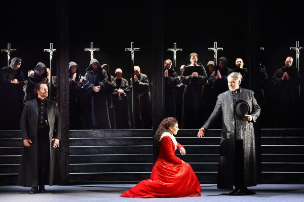Man darf sich beim durchaus kleinen Staatstheater Cottbus, einem Mehrspartenhaus zumal, wundern, welch mutige und gute Opernproduktionen dieses Haus immer wieder auf die Beine stellt. Nach einem überaus sehenswerten und ebenso erfolgreichen „Ring des Nibelungen“ zeigte man nun nach einem knappen Jahrhundert wieder Giuseppe Verdis komplexe und dramatische Oper „Don Carlo“. Das Staatstheater entschied sich in der Inszenierung des Intendanten Martin Schüler für eine Version der Oper, die in Italienisch gesungen auf der fünfaktigen Pariser UA von 1867 basiert, jedoch mehrere, vielleicht nicht nur dem Rezensenten nicht ganz eingängige Kürzungen vornimmt. Der Fontainebleau-Akt wurde zu einem kurzen Vorspiel verknappt, um die Liebe von Don Carlos und Elisabeth darzustellen.