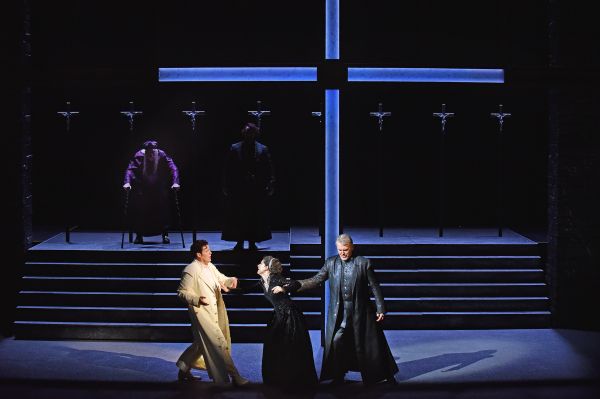 Dennoch ist es Schüler unter der musikalischen Leitung des GMD Evan Christ und im Bühnenbild von Walter Schütze sowie den stets dazu passenden geschmackvollen Kostümen von Nicole Lorenz gelungen, den Konflikt zwischen absolutistischer Machtanmaßung und dem Recht auf persönliche Freiheit sowie jenen der Liebe von Elisabeth und Carlos eindrucksvoll und zeitweise mit bemerkenswerter Schärfe zu zeigen. Die große Szene im 6. Bild des 3. Aktes zwischen König Philipp II. und dem Großinquisitor ist in solcher Intensität und Aussagekraft wohl selten zu sehen und wurde zu einem Höhepunkt des Abends, wenn nicht d e m Höhepunkt. Der in Cottbus gastierende und von der Semperoper kommende Tilmann Rönnebeck als Philipp II. und Jörn E. Werner als wahrlich greisenhaft und seine Blindheit klar dokumentierender sowie äußerst bedrohlich wirkender Großinquisitor zeigen hier Elemente eines bemerkenswerten darstellerischen Könnens. Auch stimmlich lassen beide nichts zu wünschen übrig.